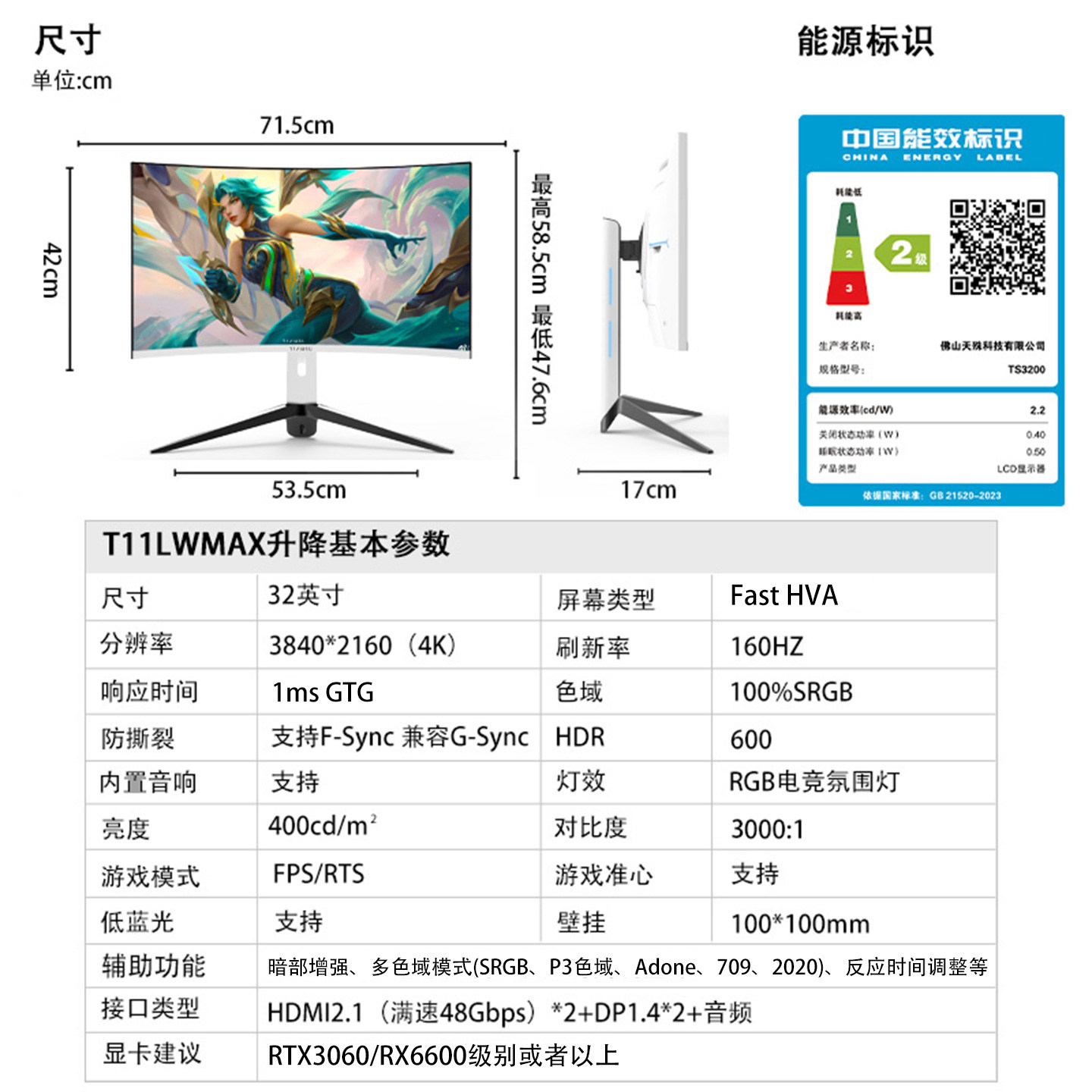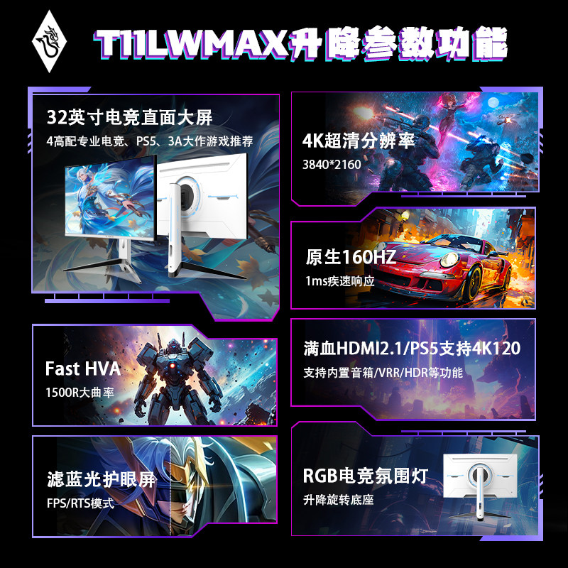 32英寸4K160HZ曲面显示器QD量子点ps5屏幕HDMI2.1电竞屏升降VRR