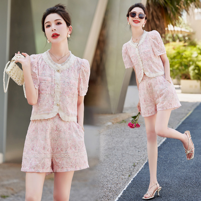 蕾丝短裤小香风套装女名媛2025夏装新款小个子短袖两件套洋气时尚