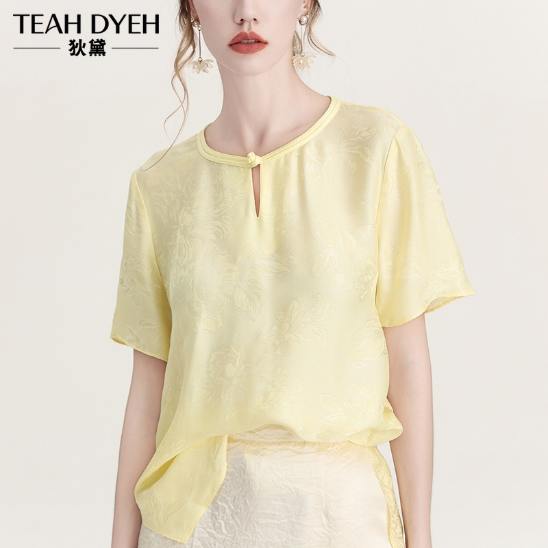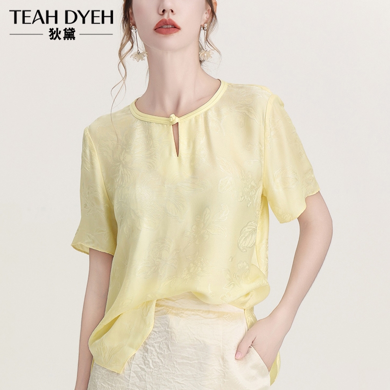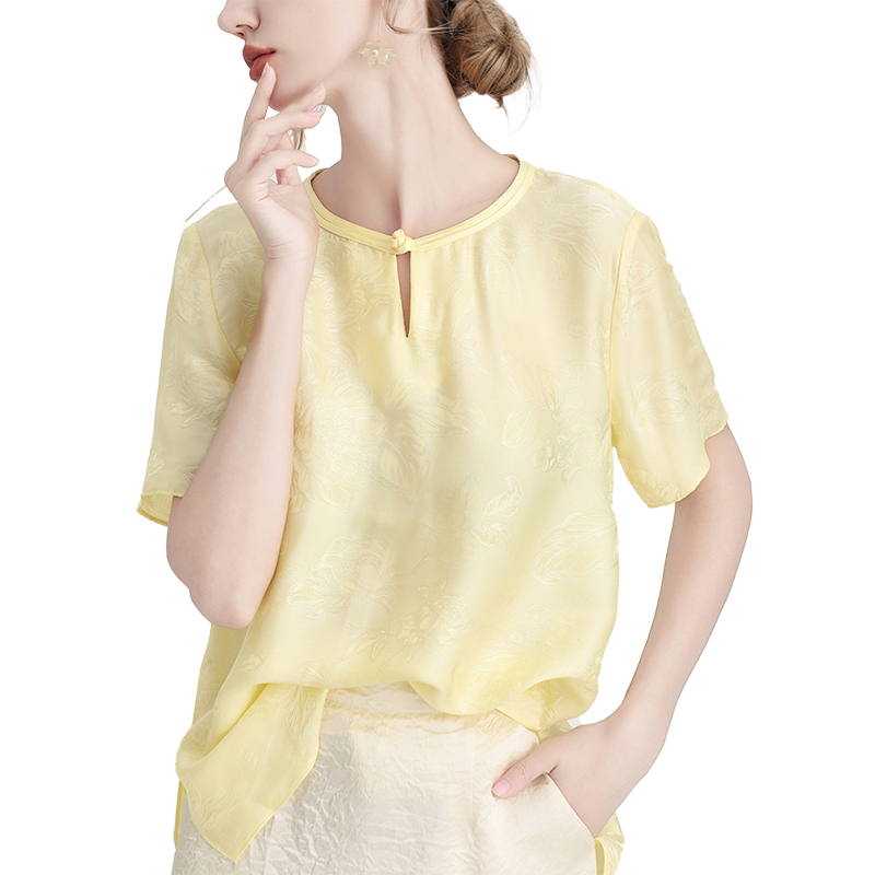 新中式国风高级感真丝香云纱提花盘扣上衣短袖t恤女装24夏装新款