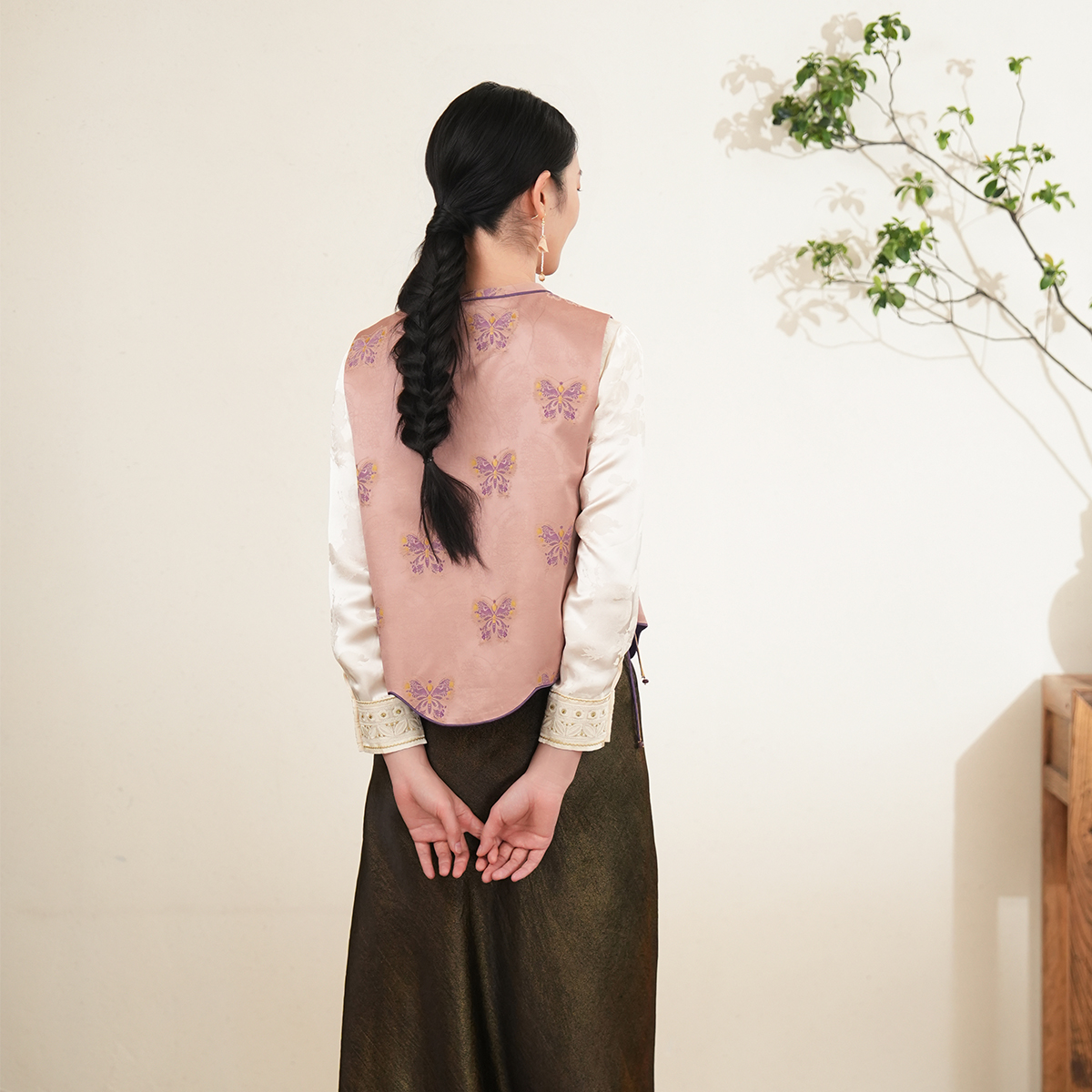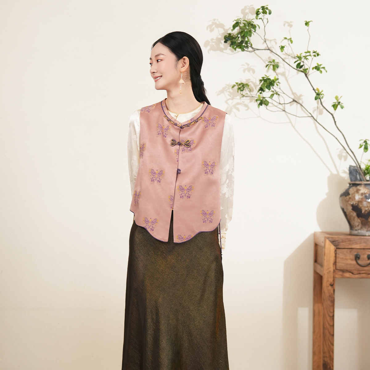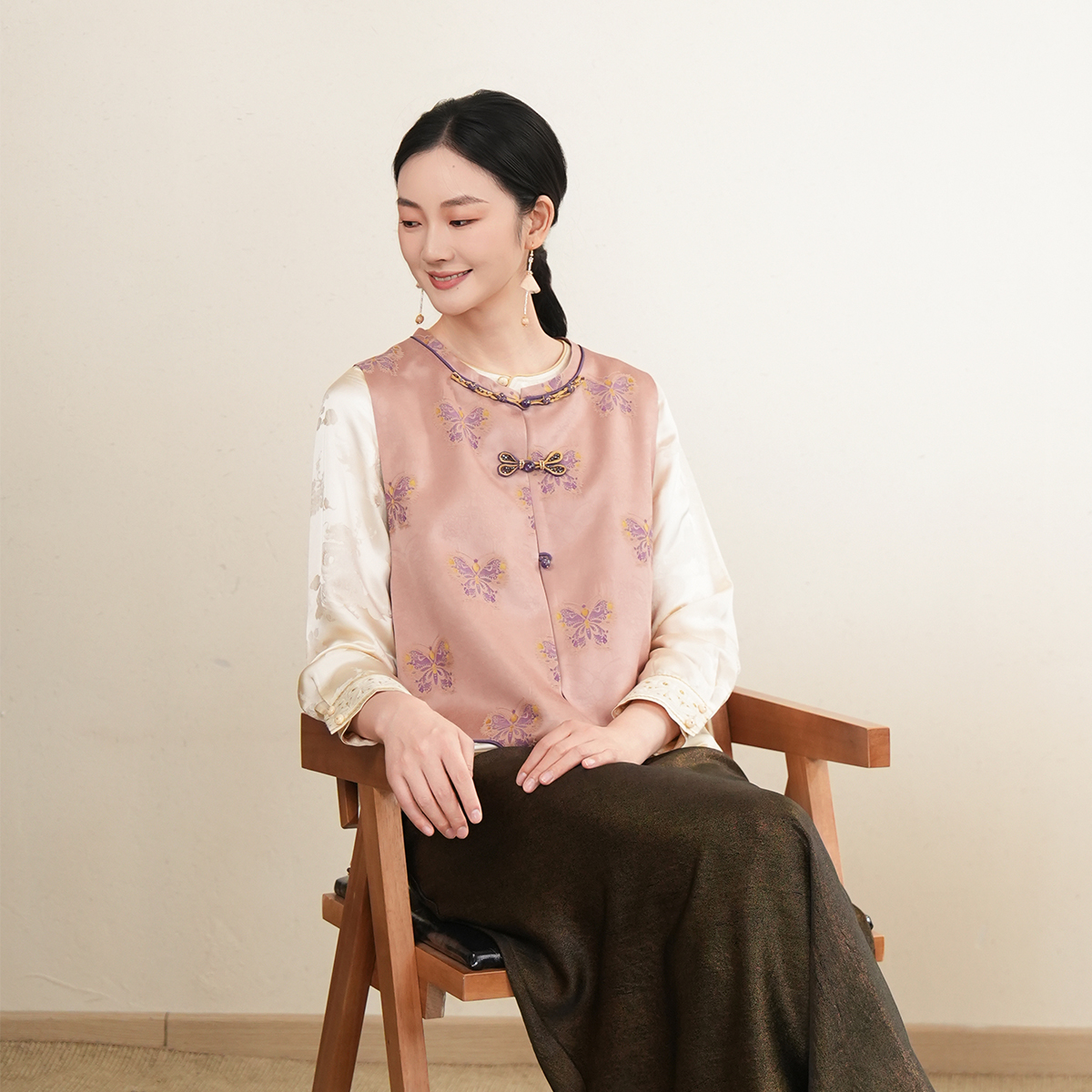 布符「百蝶真丝羊毛双色蝴蝶花扣马甲」2025年秋新品流苏盘扣女装