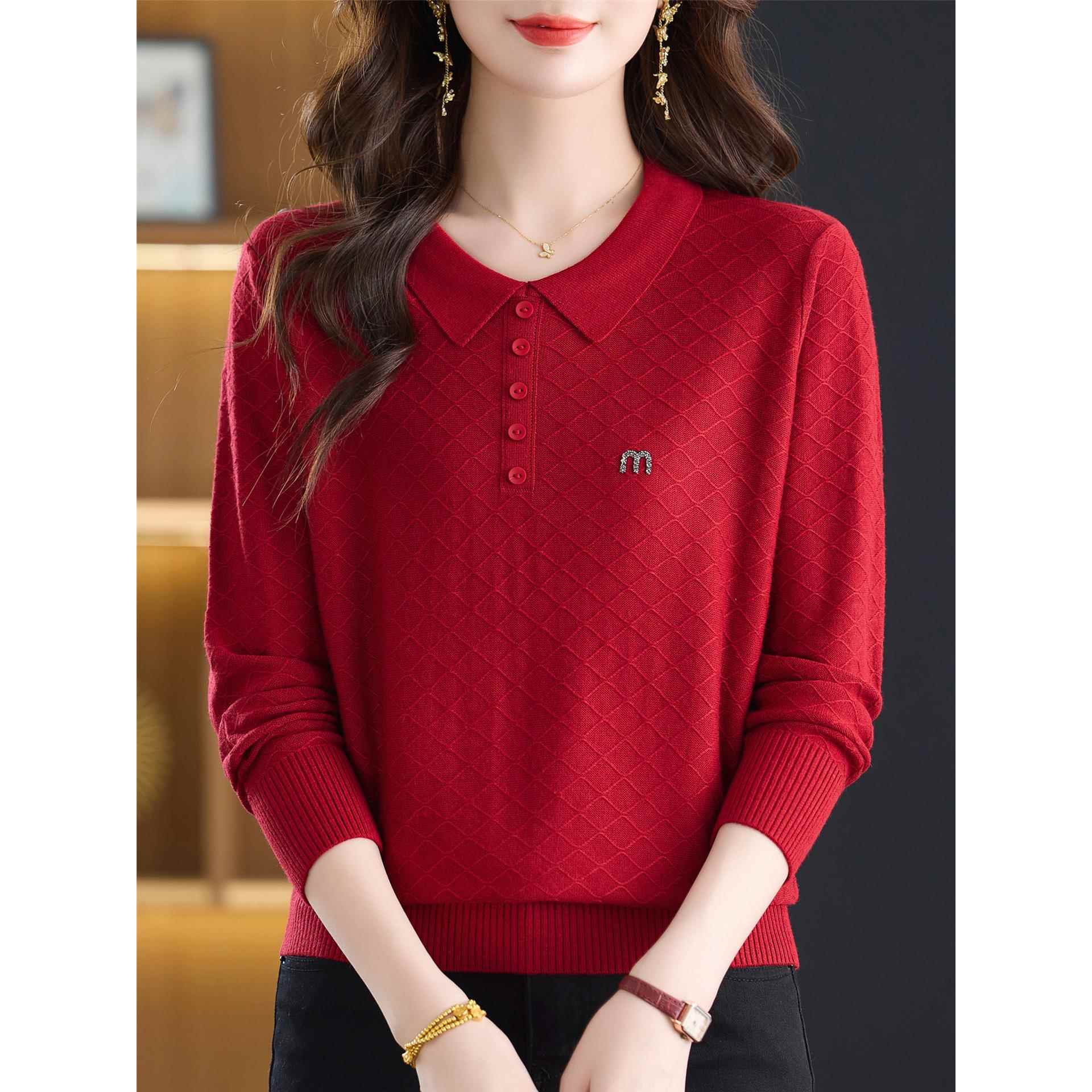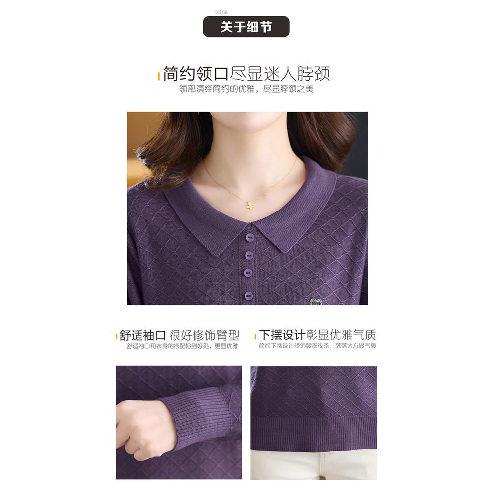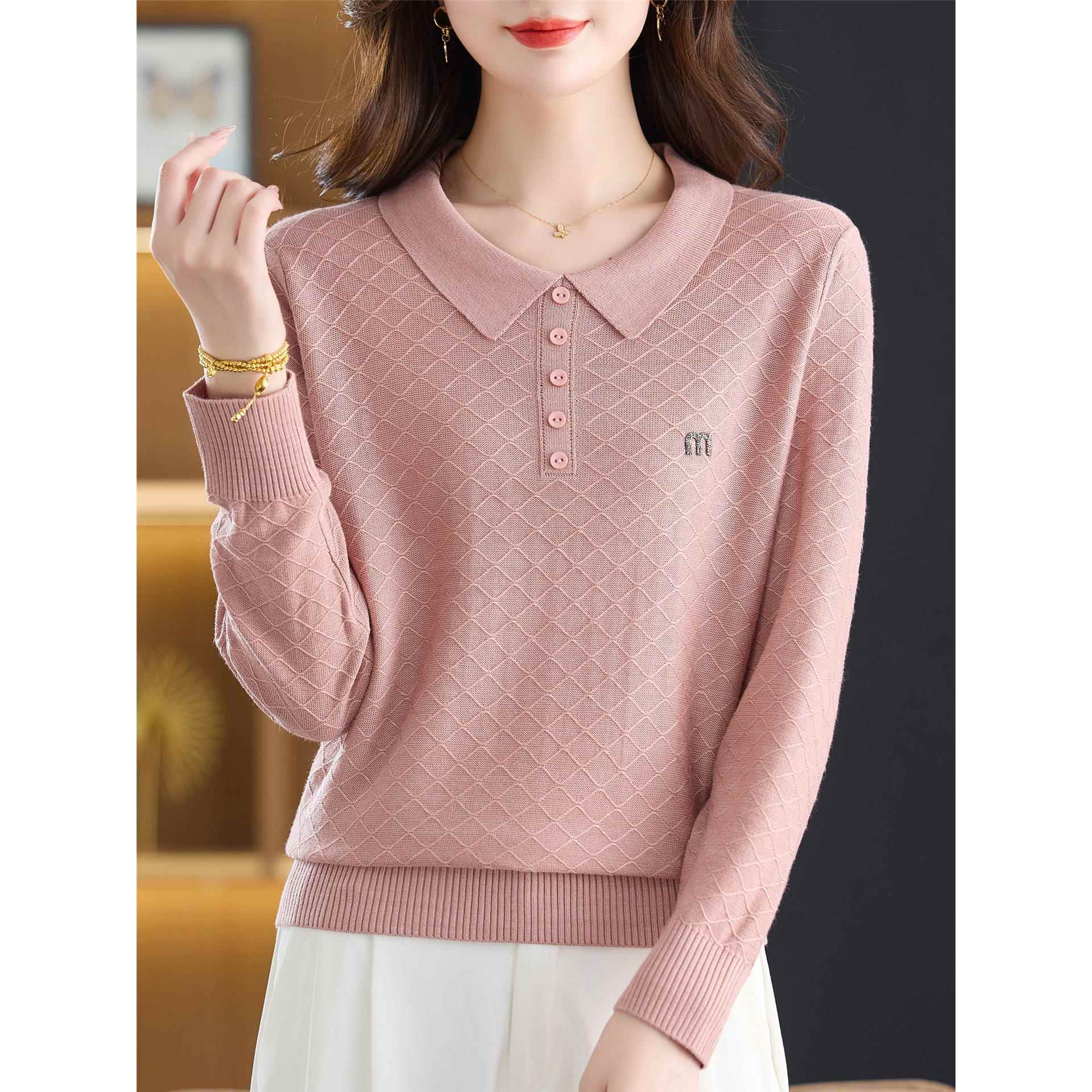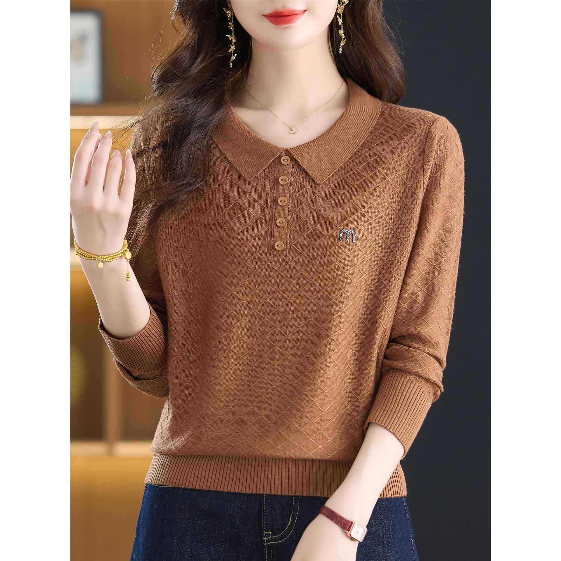 2025秋季新款桑蚕丝长袖t恤女妈妈装翻领上衣宽松遮肚针织打底衫