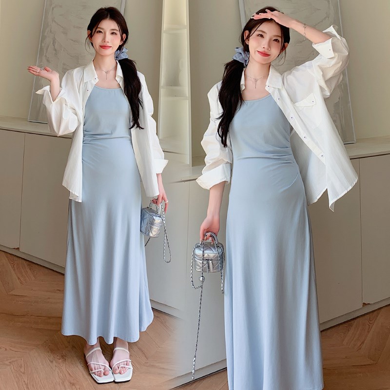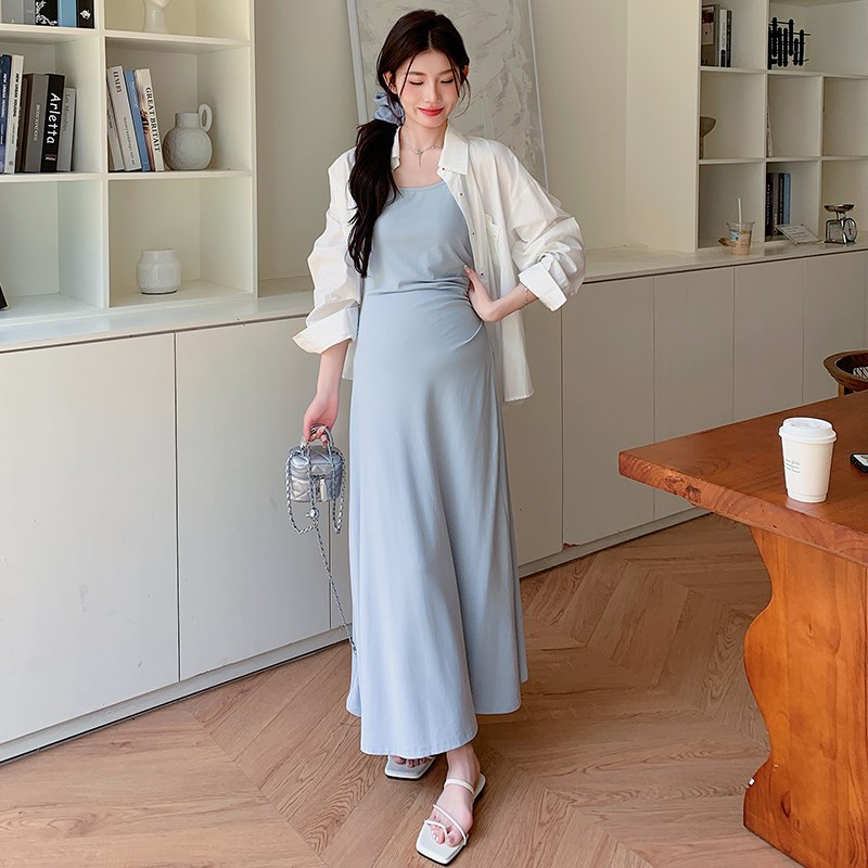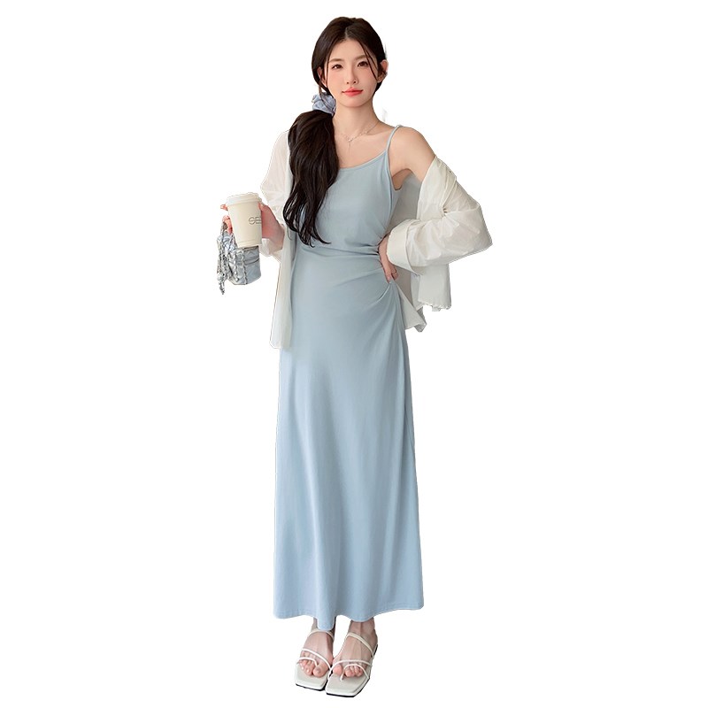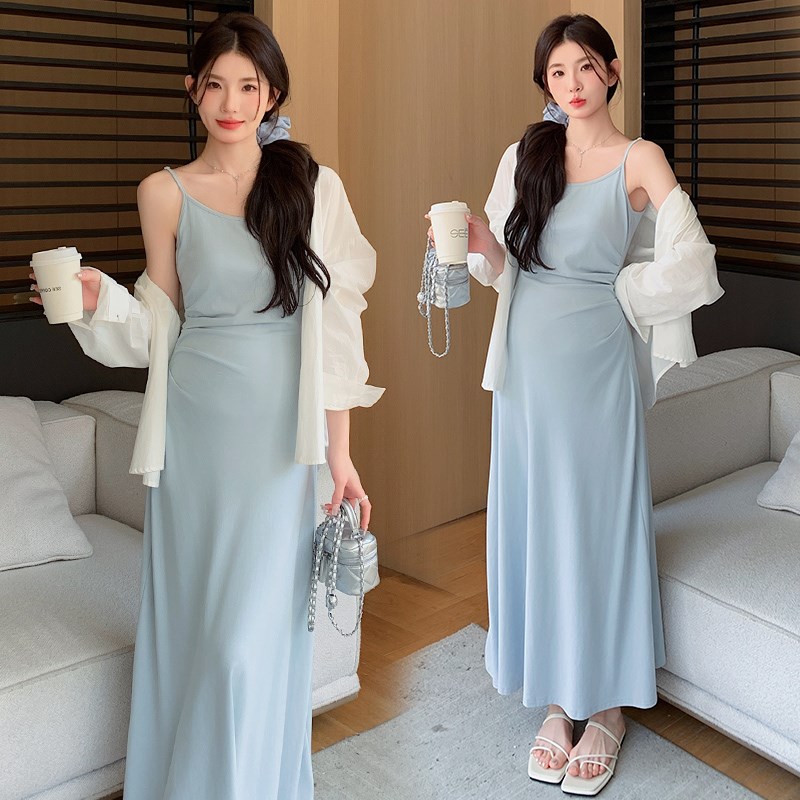 孕妇装2024新款夏款连衣裙时尚蓝色吊带裙防晒衣两件套Y夏季套装