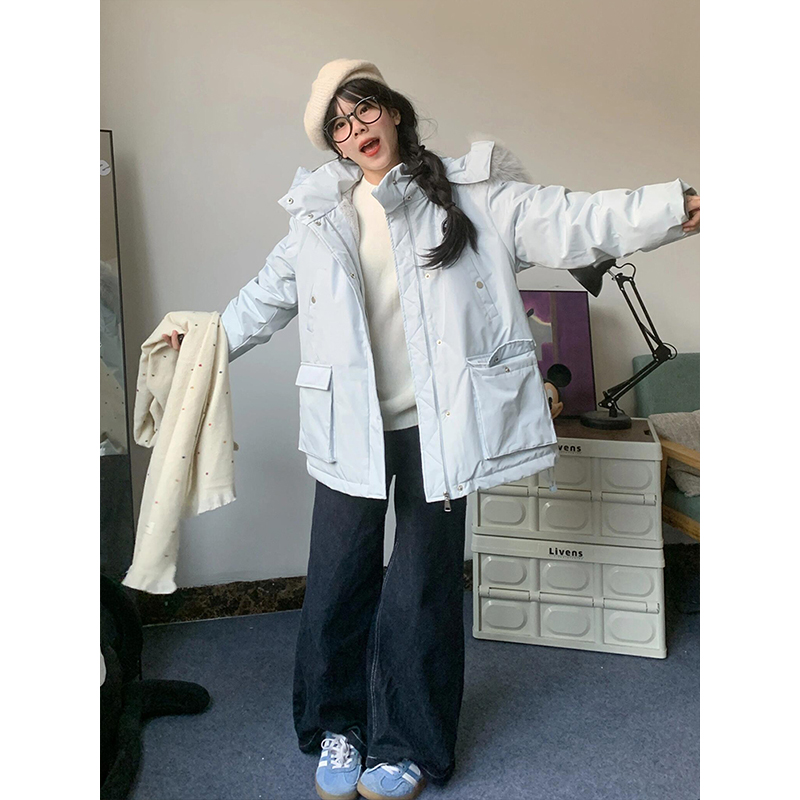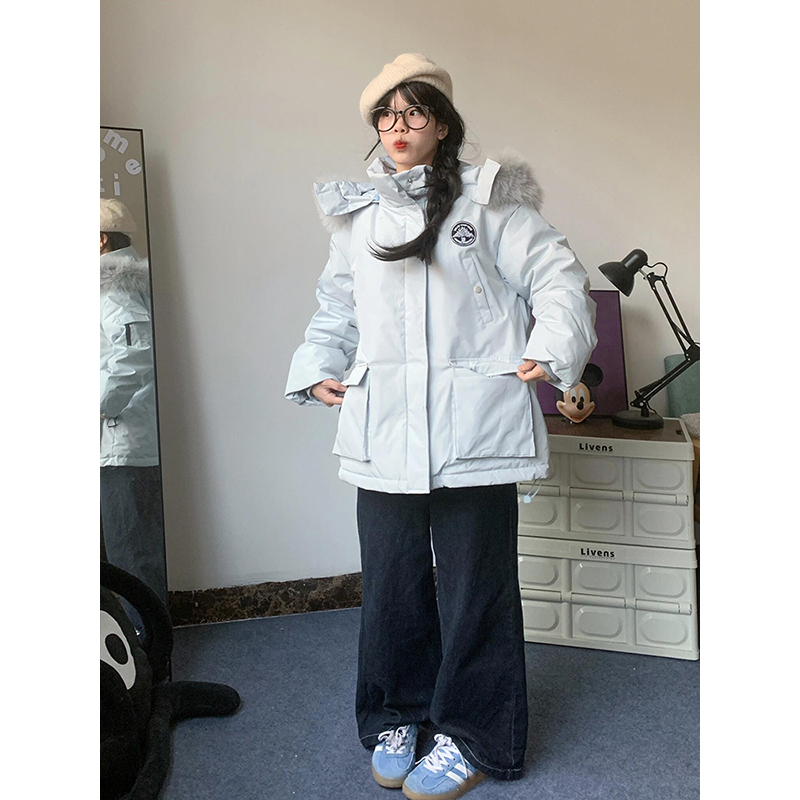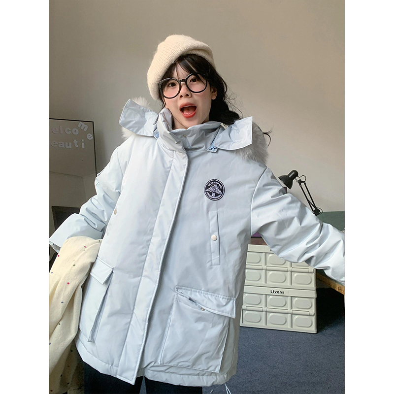300斤大码胖mm工装蓝色大毛领棉服女学院风加厚中长款派克服外套