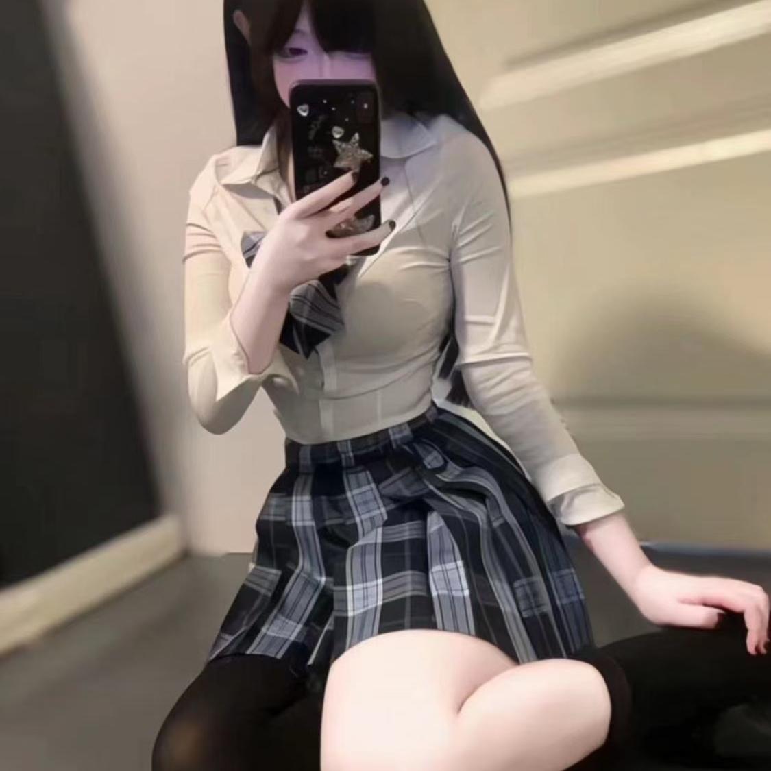 JK制服纯欲紧身收腰衬衫长袖性感格子裙学院风百褶裙套装女时尚秋