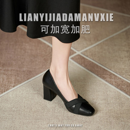 小码粗跟单鞋31一33方头交叉带装饰韩版舒适日常高跟鞋大码41一43