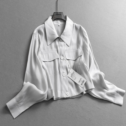 纯色翻盖口袋显瘦短款薄款冰感翻领单排扣长袖百搭通勤女衬衫Z937