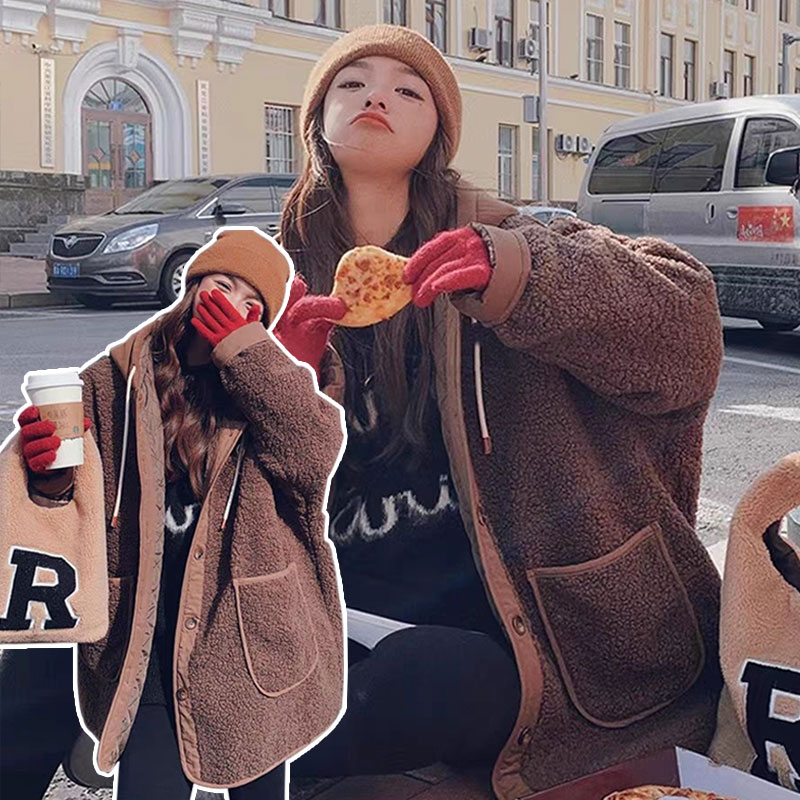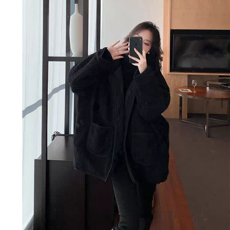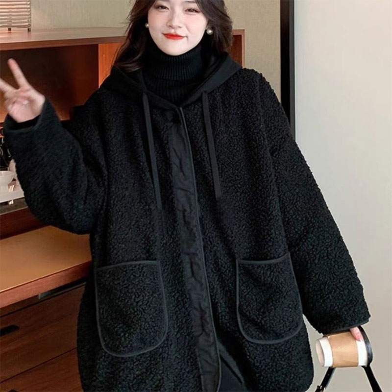 300斤大码女装夹棉加厚羊羔毛外套女胖mm秋冬黑色高级感连帽棉服