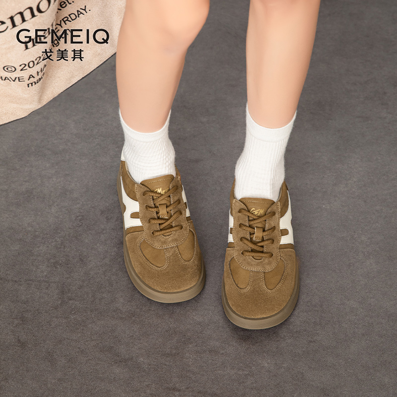 戈美其年新款秋季真皮复古德训鞋女厚底交叉绑带爆款休闲板鞋