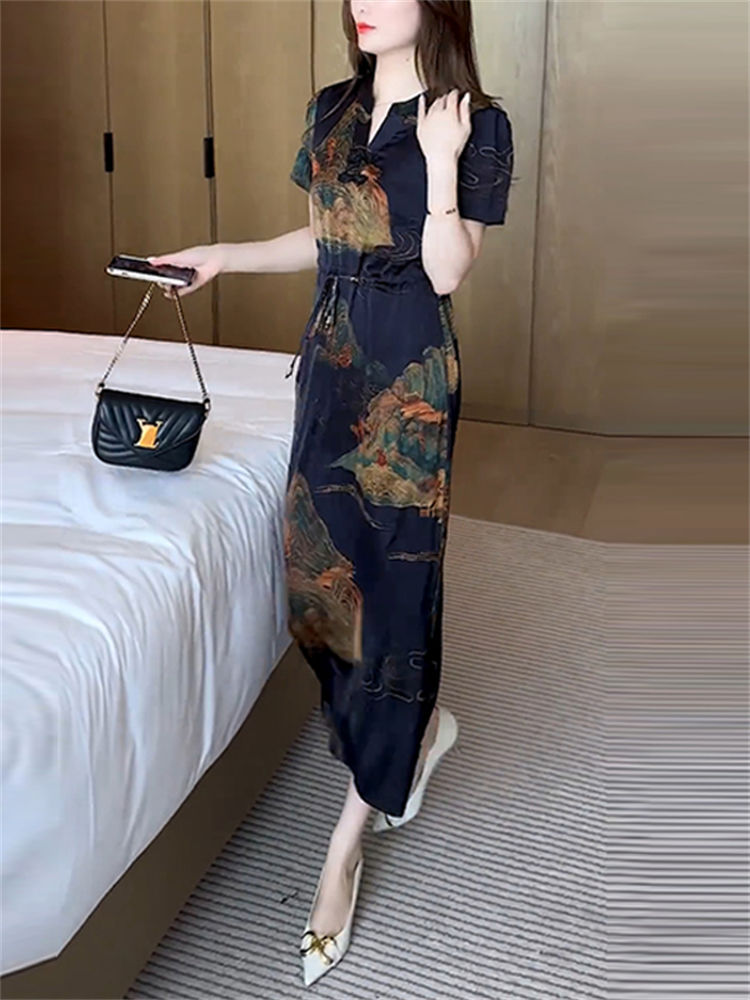 高级感新中式气质印花短袖连衣裙女2024夏季新款V领系带显瘦裙子