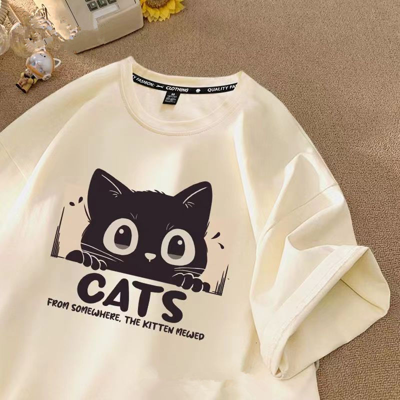2024韩版猫咪日系休闲潮版印花宽松半袖体恤衫夏季情侣款短袖