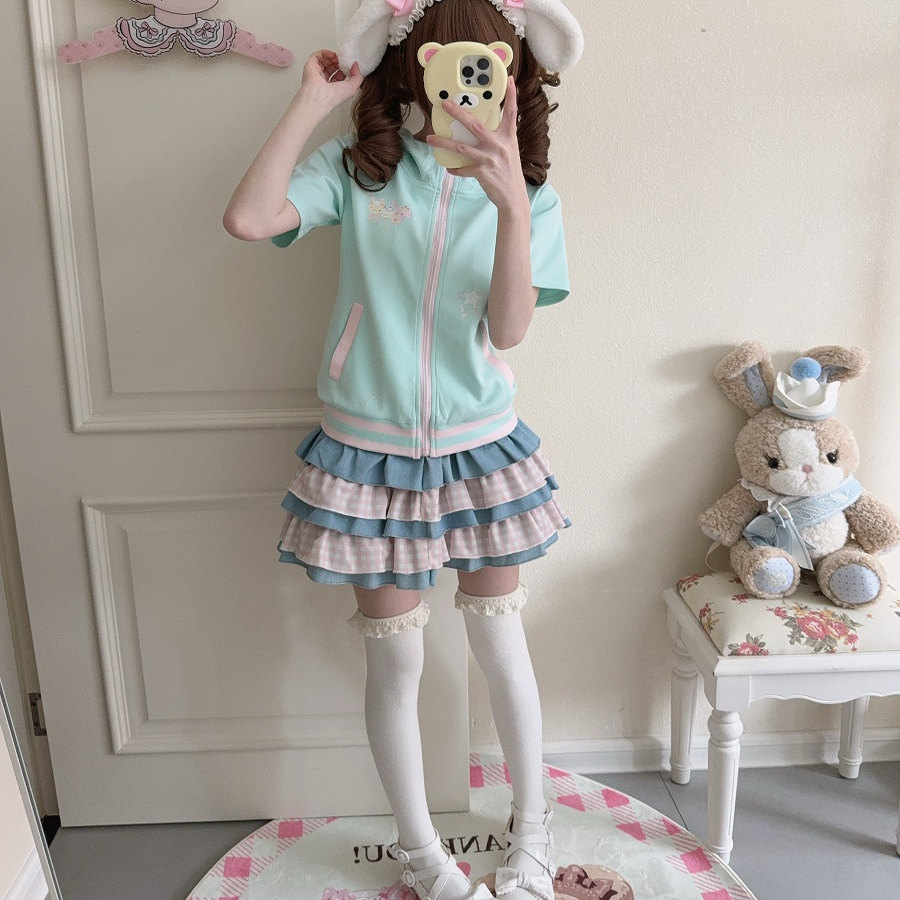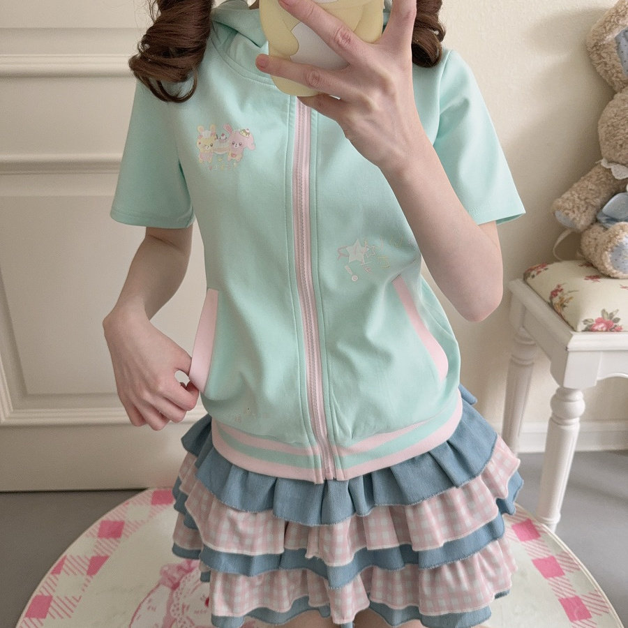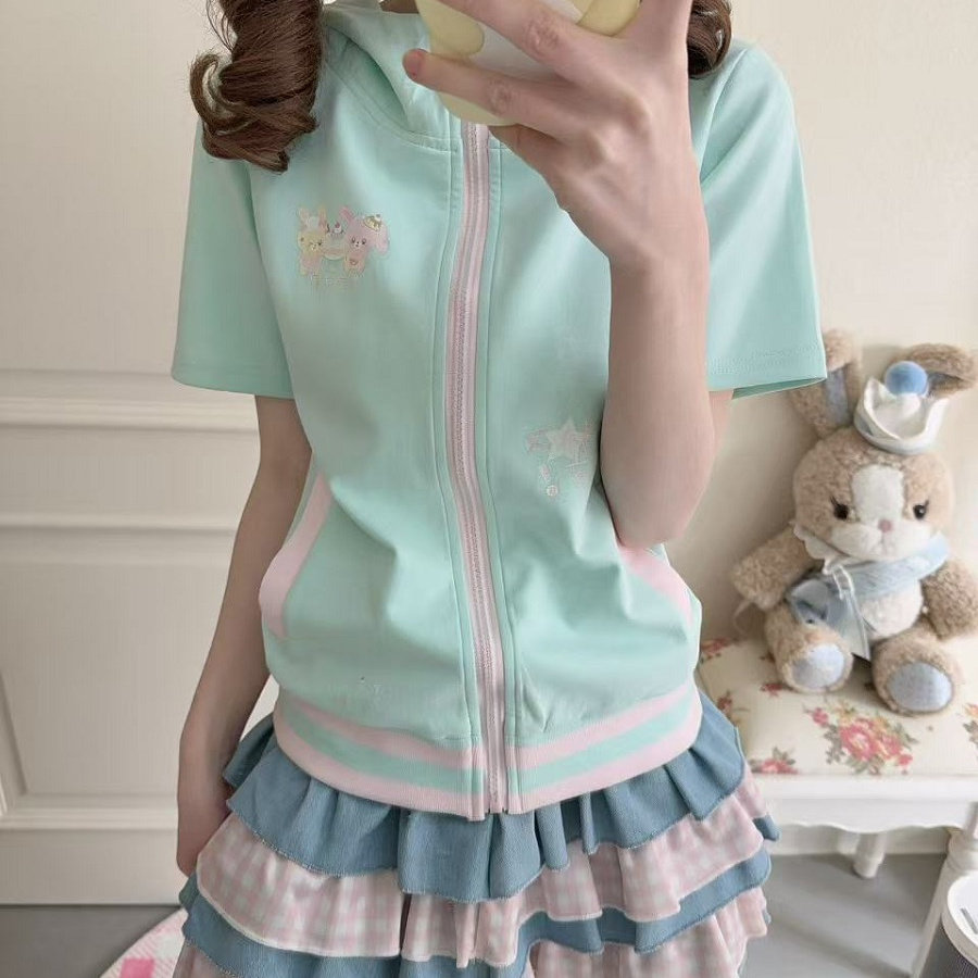 原创自制可爱辣妹修身T恤女宅萌百搭猫耳朵连帽夏季宅系短袖外套