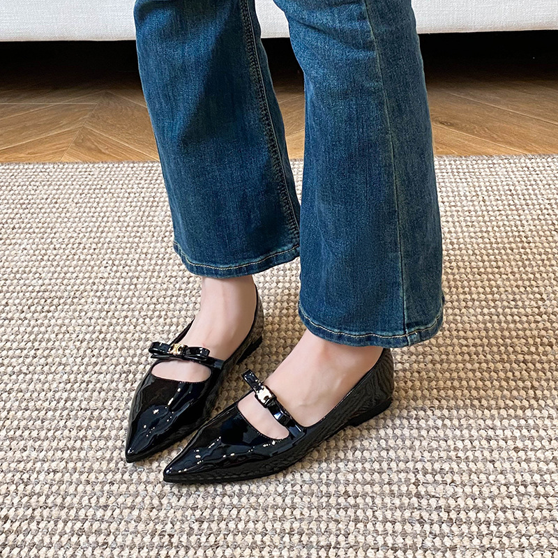 2025年新款法式小金皮带扣尖头蝴蝶结漆皮平底百搭通勤宴会单鞋女