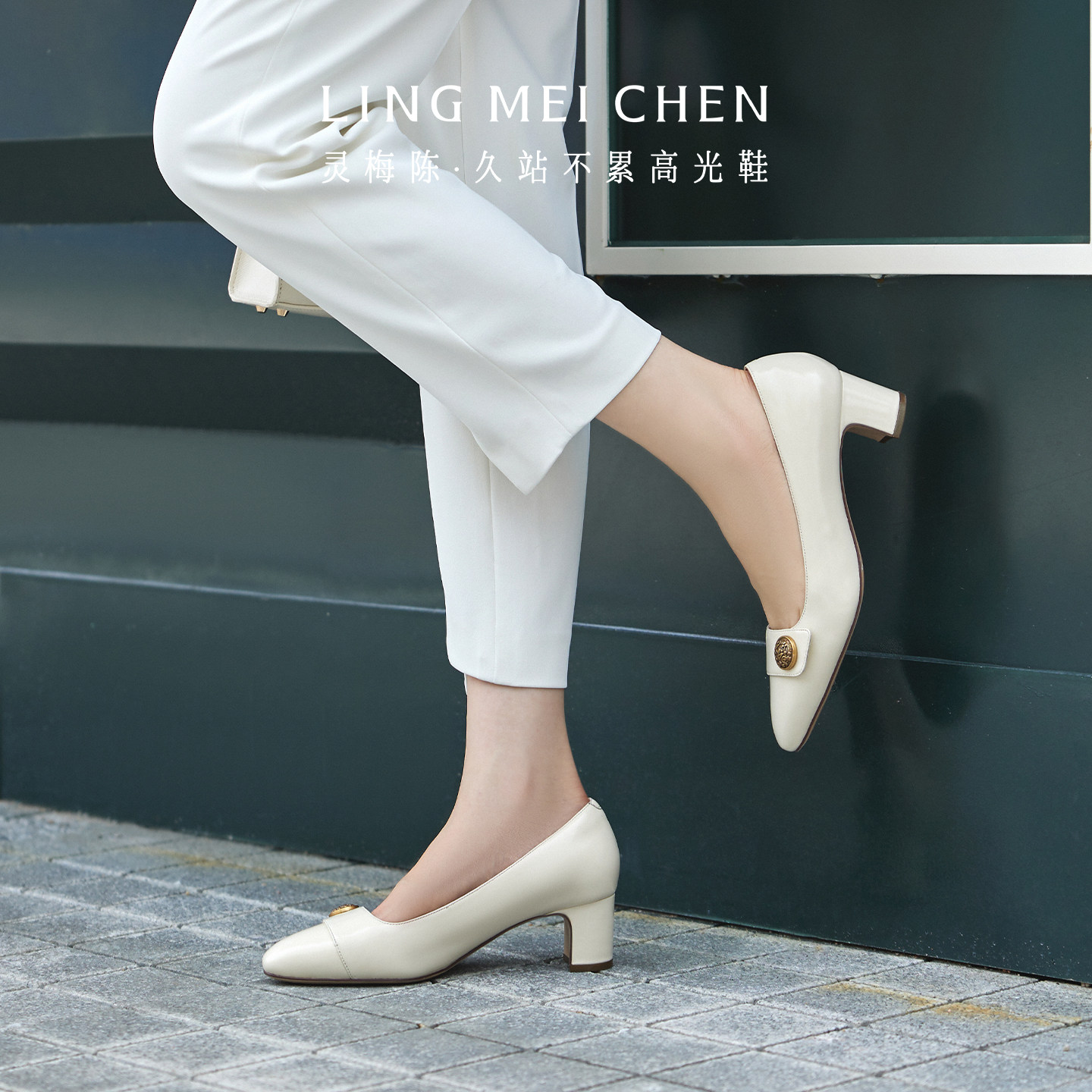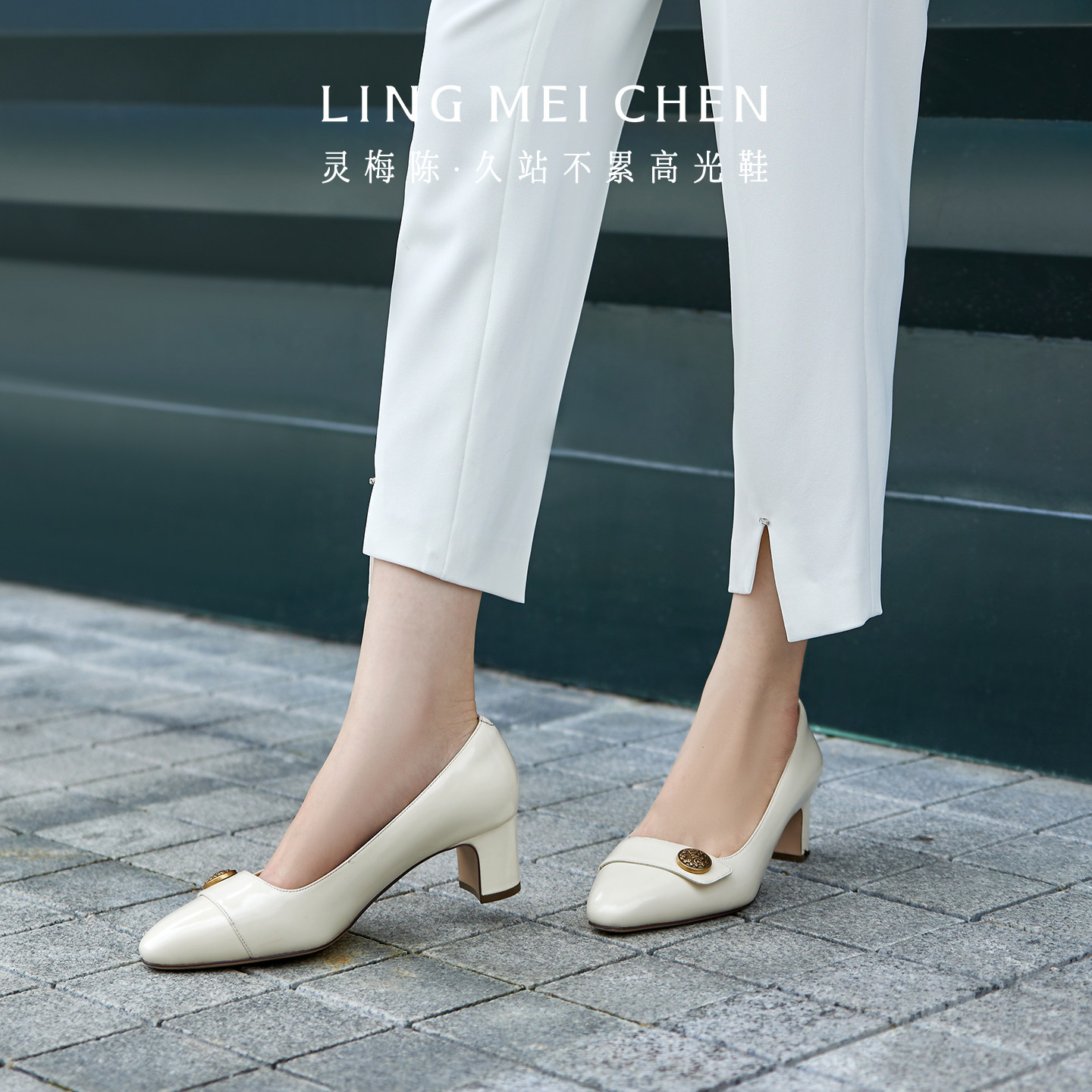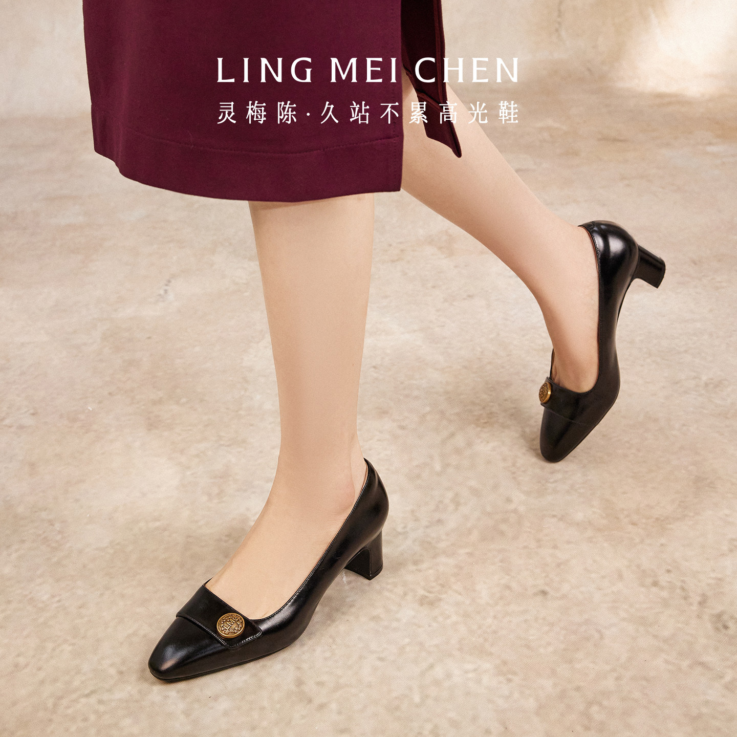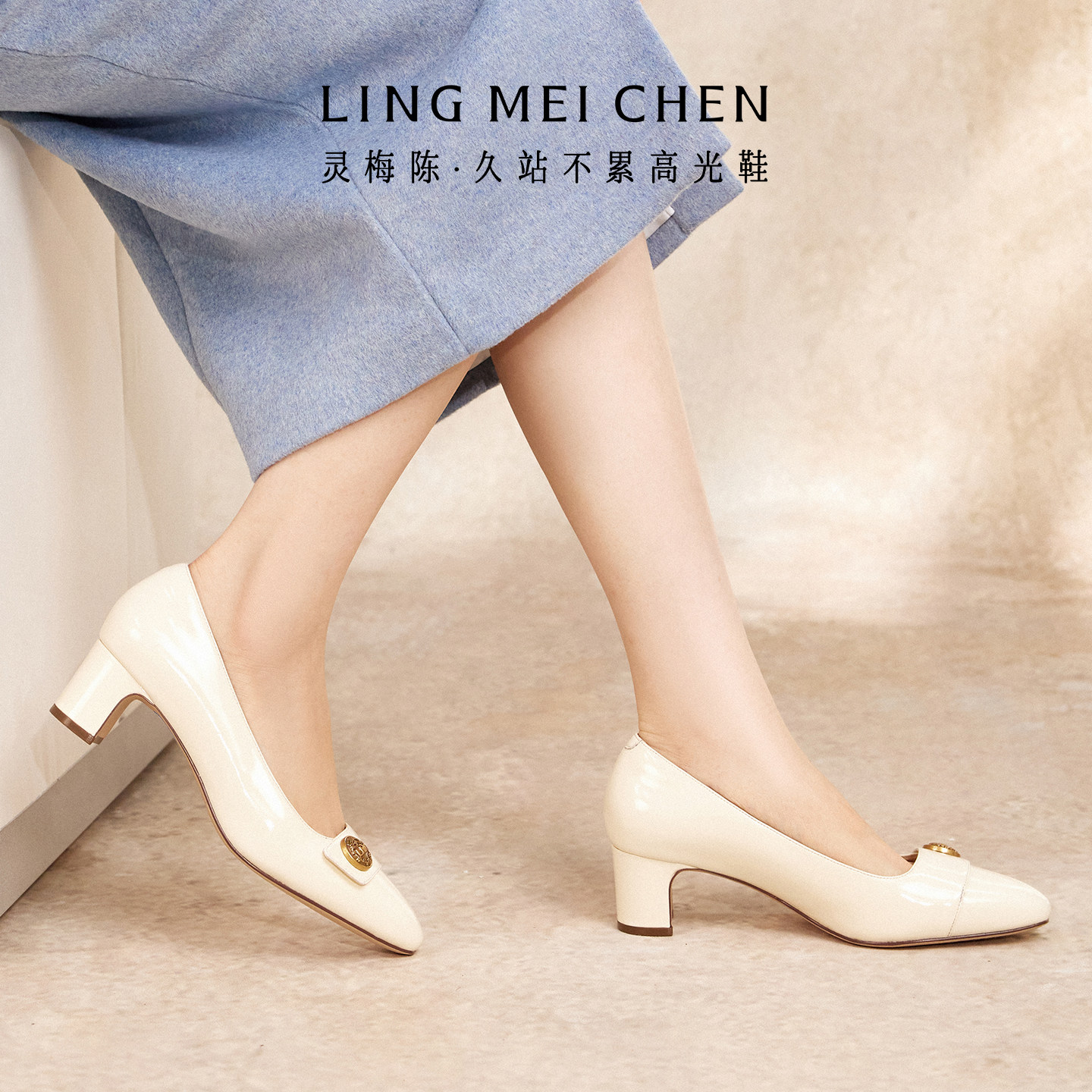 灵梅陈高光鞋法式高跟鞋优雅粗跟浅口单鞋中跟皮鞋女通勤真皮瓢鞋