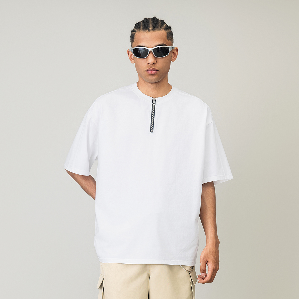 美式国潮半拉链纯色圆领短袖T恤男夏季新款宽松情侣休闲上衣
