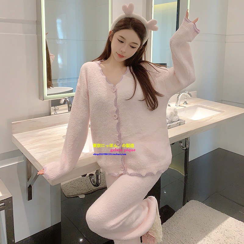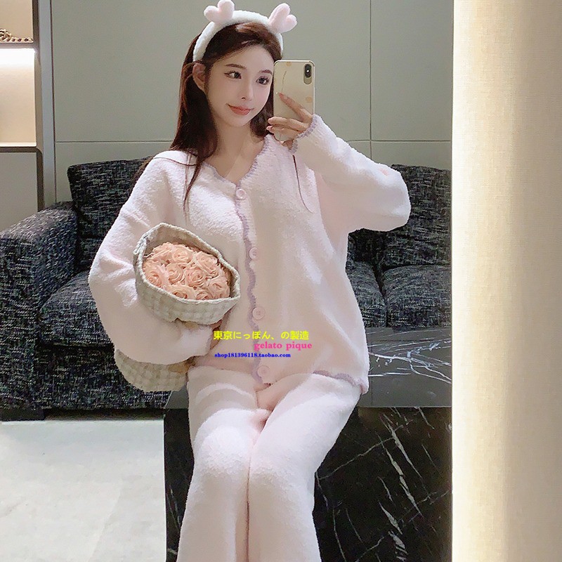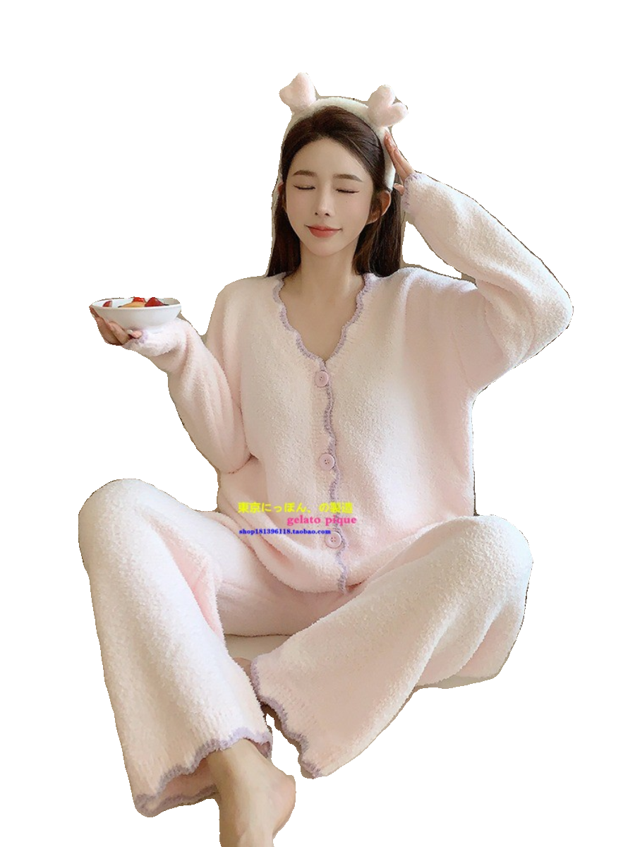 日本GP pique冬软绵绵睡衣女甜美花边简约半边绒加厚家居服可外穿