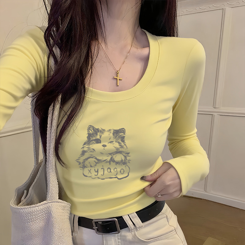 时尚白色甜美正肩U领修身百搭长袖女2025秋季纯棉系薄款打底T恤潮