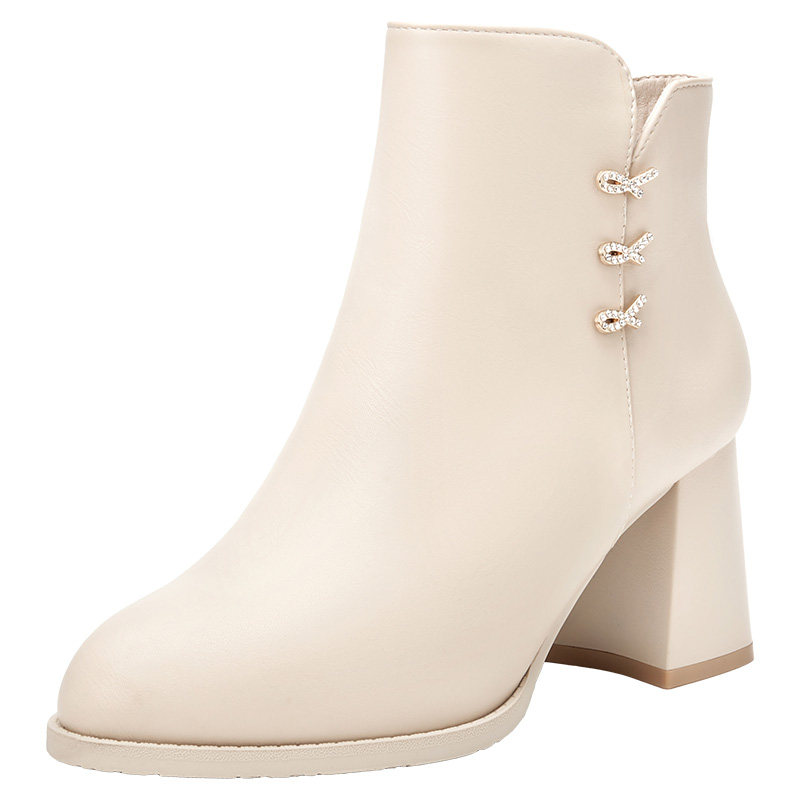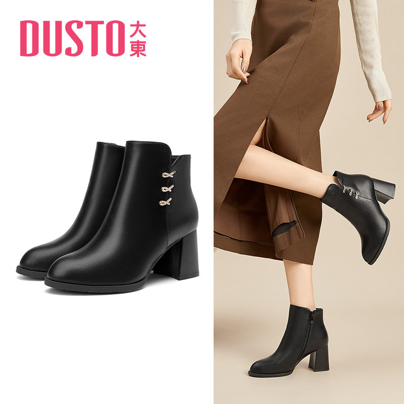 大东官方粗跟高跟短靴女2025新款冬季加绒皮靴高跟靴白色靴子女款