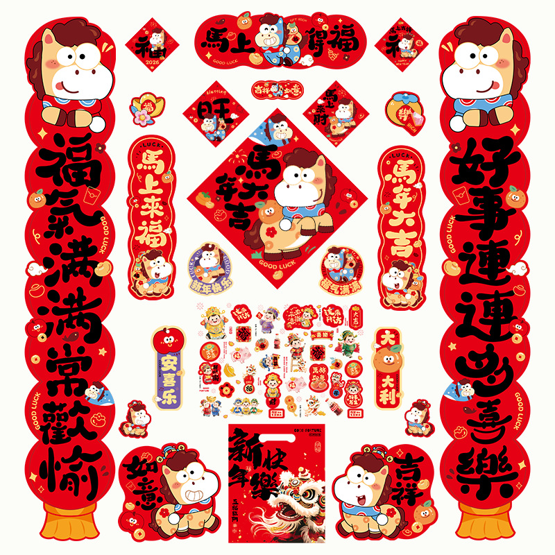 马年2026新年卡通对联春节装饰硬卡纸福字门贴春联大礼包套装用品