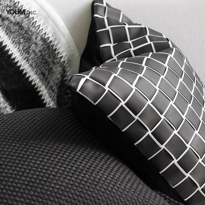 设计师推荐黑白抱枕沙发靠垫棉麻编织皮革简约现代靠枕样板间靠包