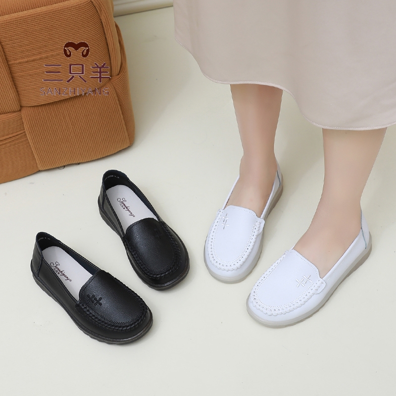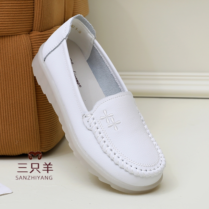 三只羊2025新款四季休闲妈妈鞋真皮防滑软底白色护士鞋黑色工作鞋