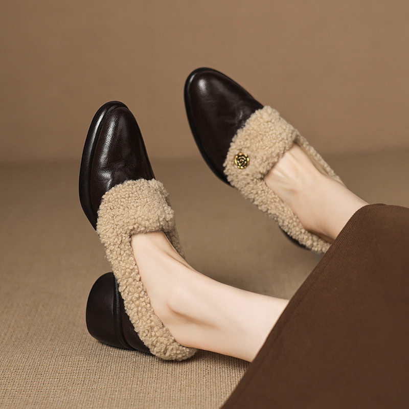 女士山茶花一脚蹬时尚2025年秋冬尖头粗跟中跟加绒厚气质深口单鞋