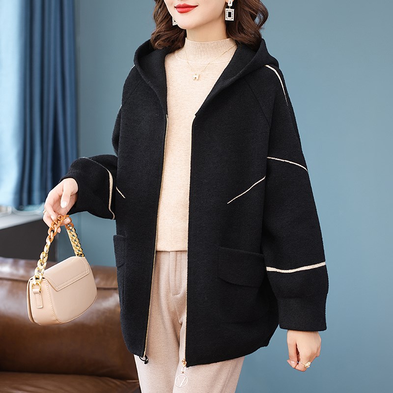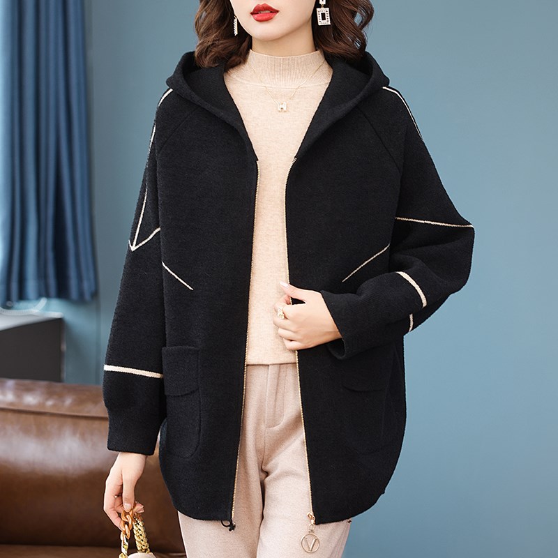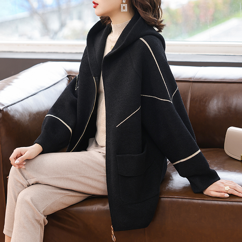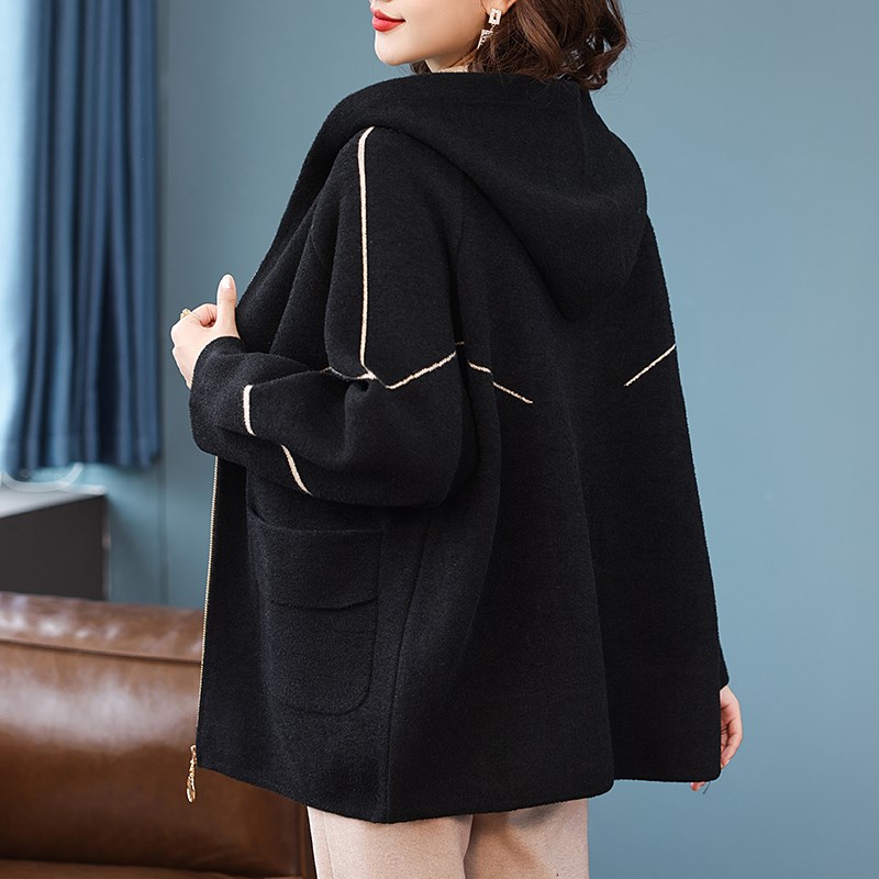 妈妈春秋中长款针织外套中年女装秋装连帽上衣中老年休闲夹克风衣