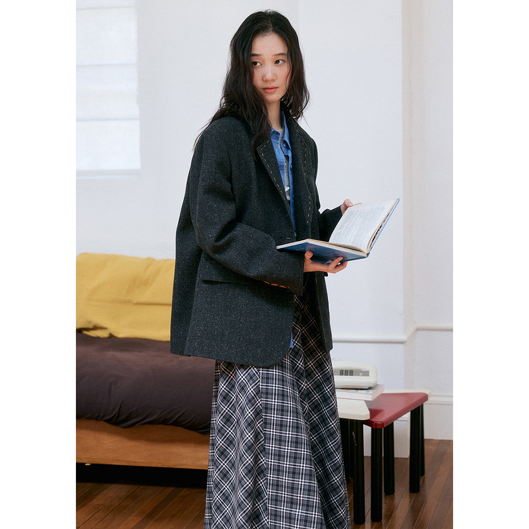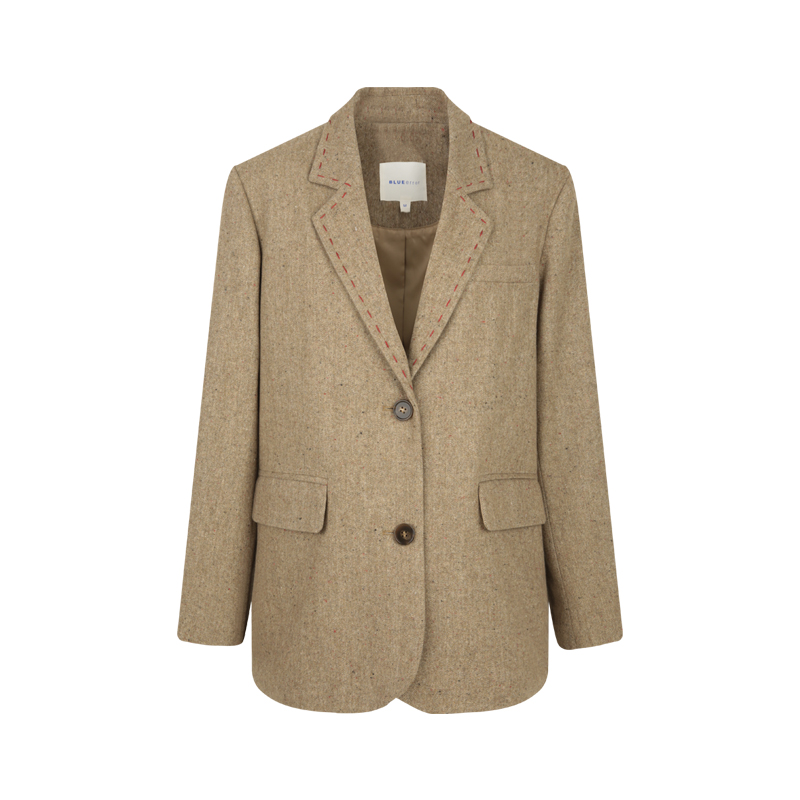 BLUEerror 手工缝线翻领羊毛卡其色毛呢西装外套女法式慵懒呢子秋