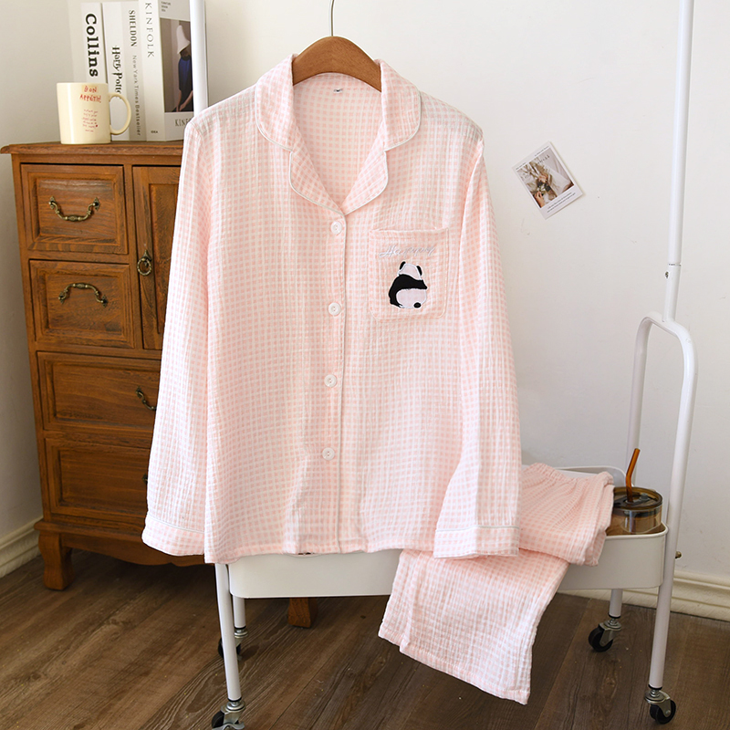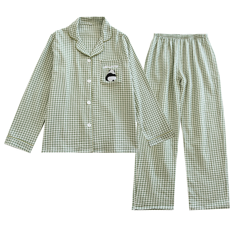 格子熊猫睡衣男女春秋夏季纯棉纱布双层薄款长袖情侣家居服套装