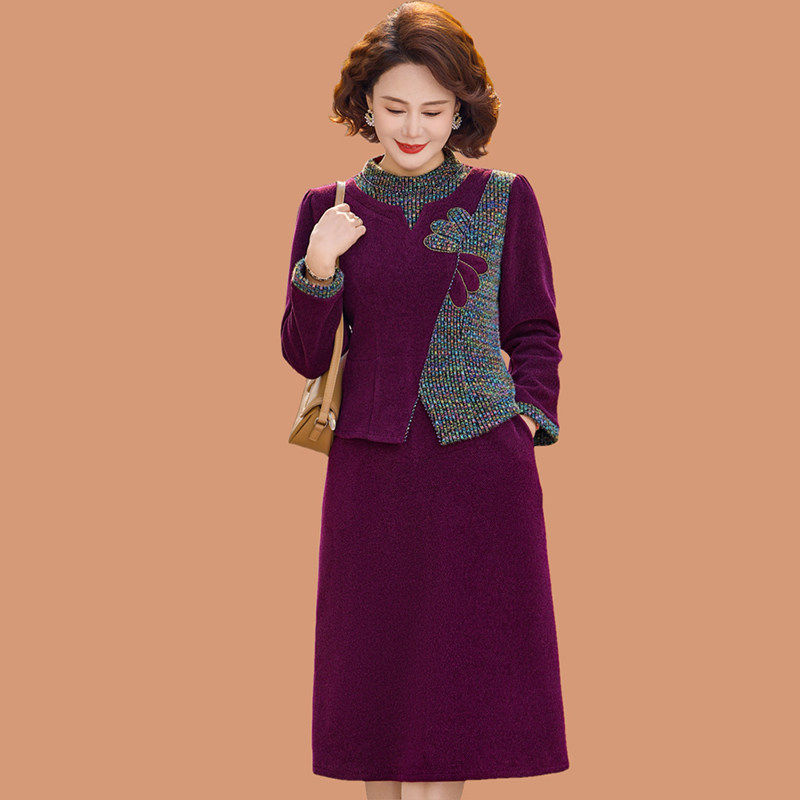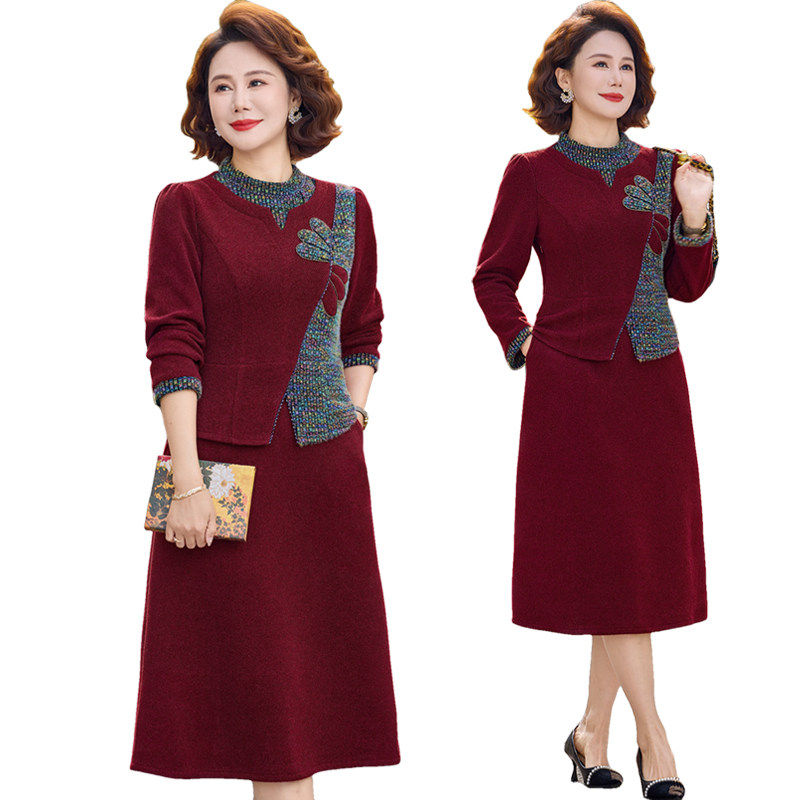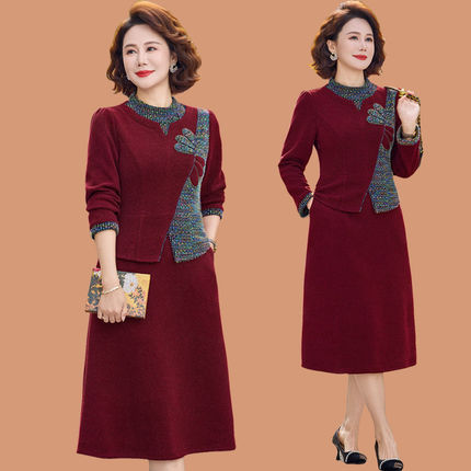 妈妈春季新款假两件连衣裙中长款中老年女秋冬喜婆婆婚宴装裙子