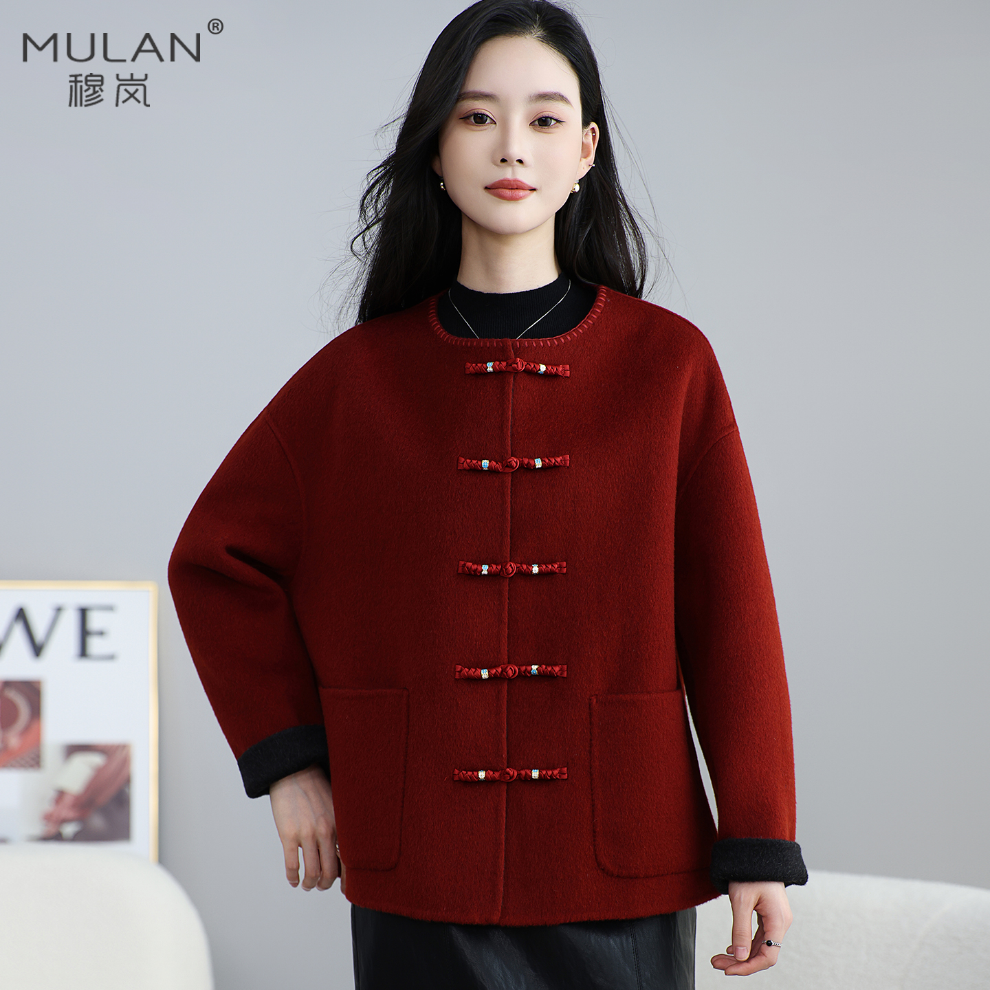 秋冬新短款中式国风盘扣双面呢羊绒大衣女式羊毛撞色宽松大码外套