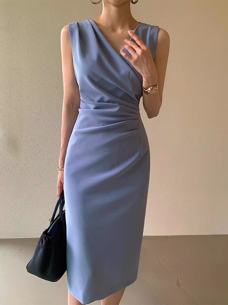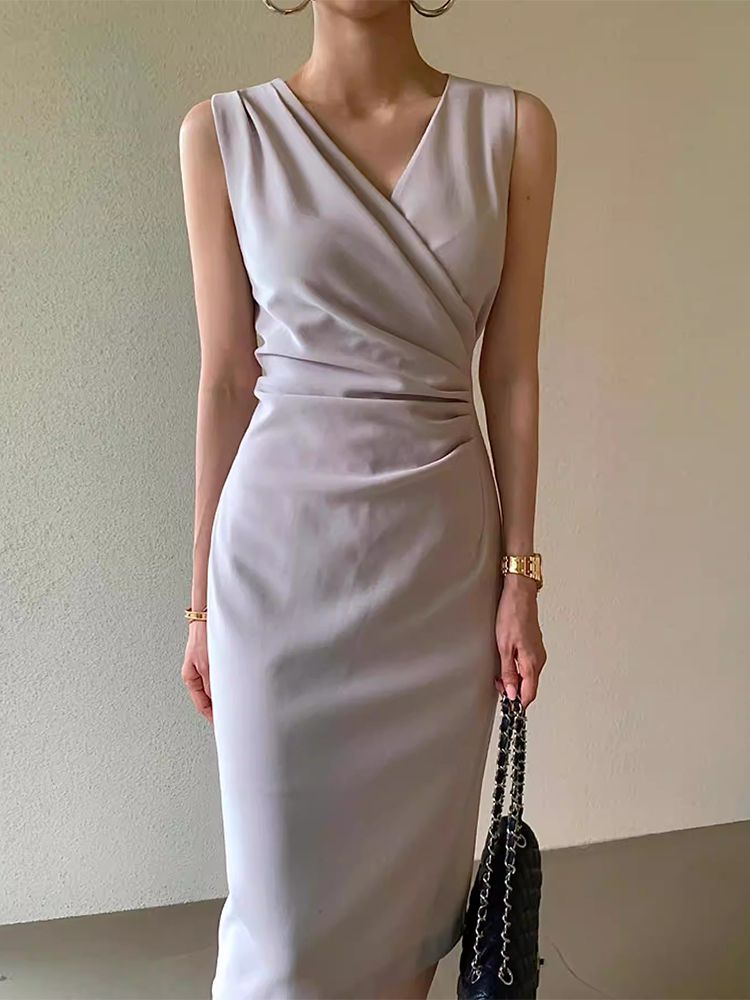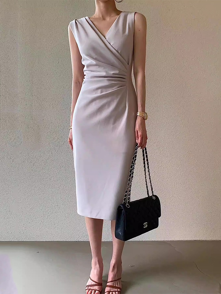 V领褶皱修身中长款背心连衣裙