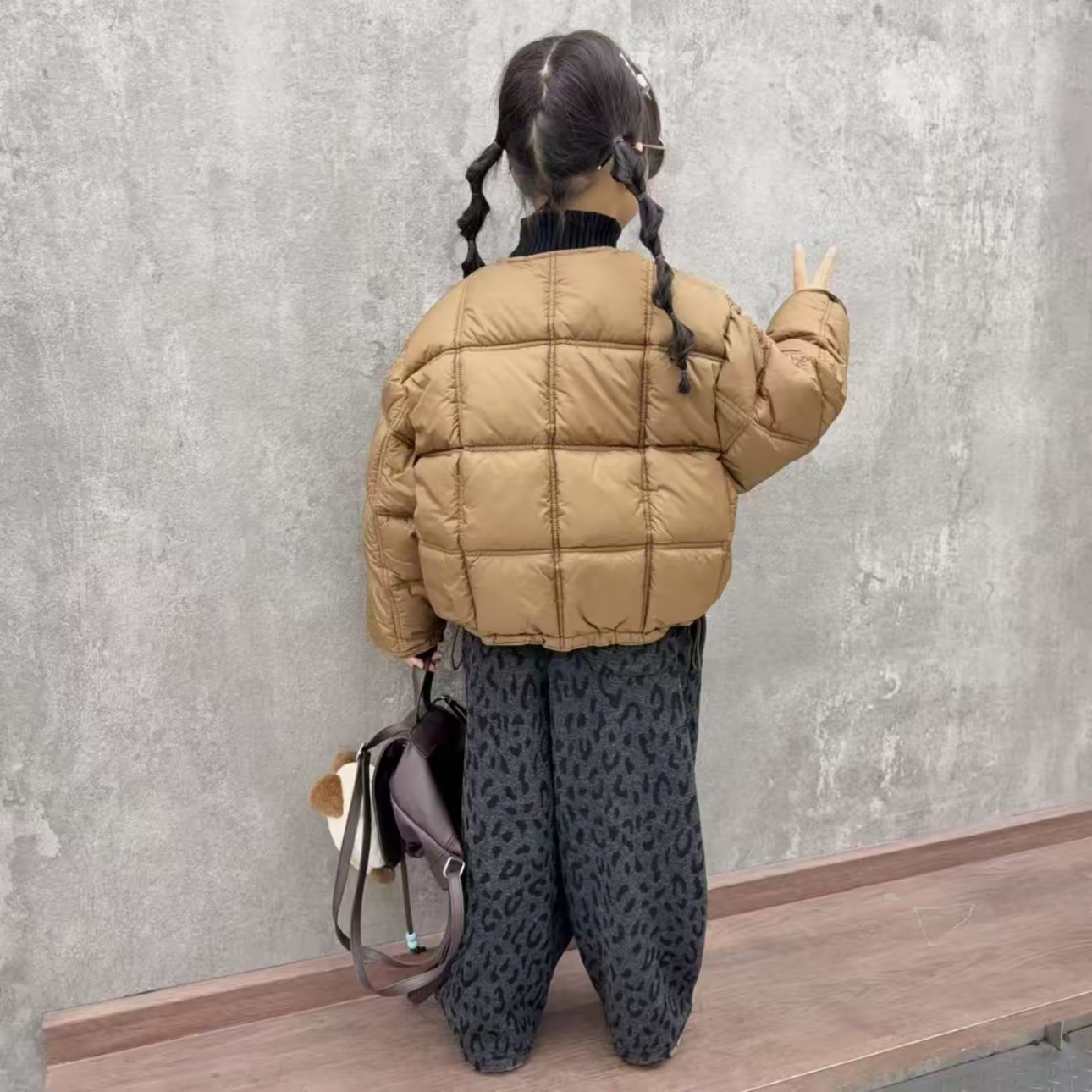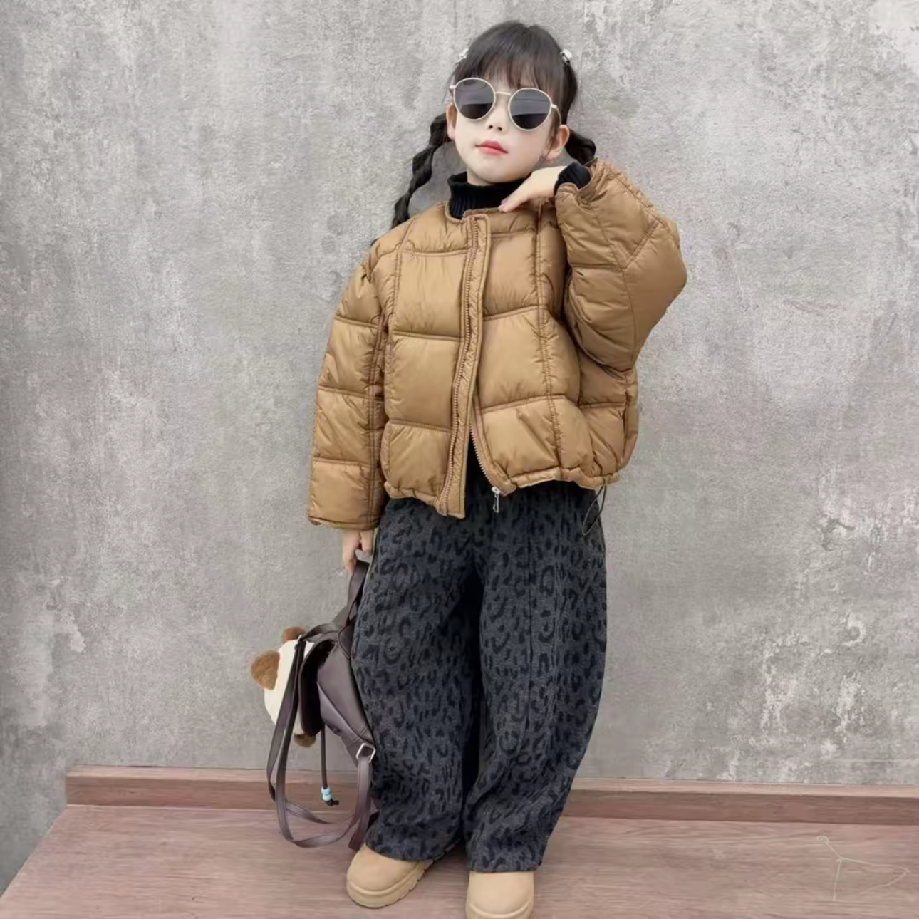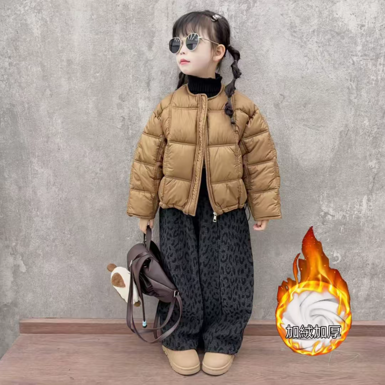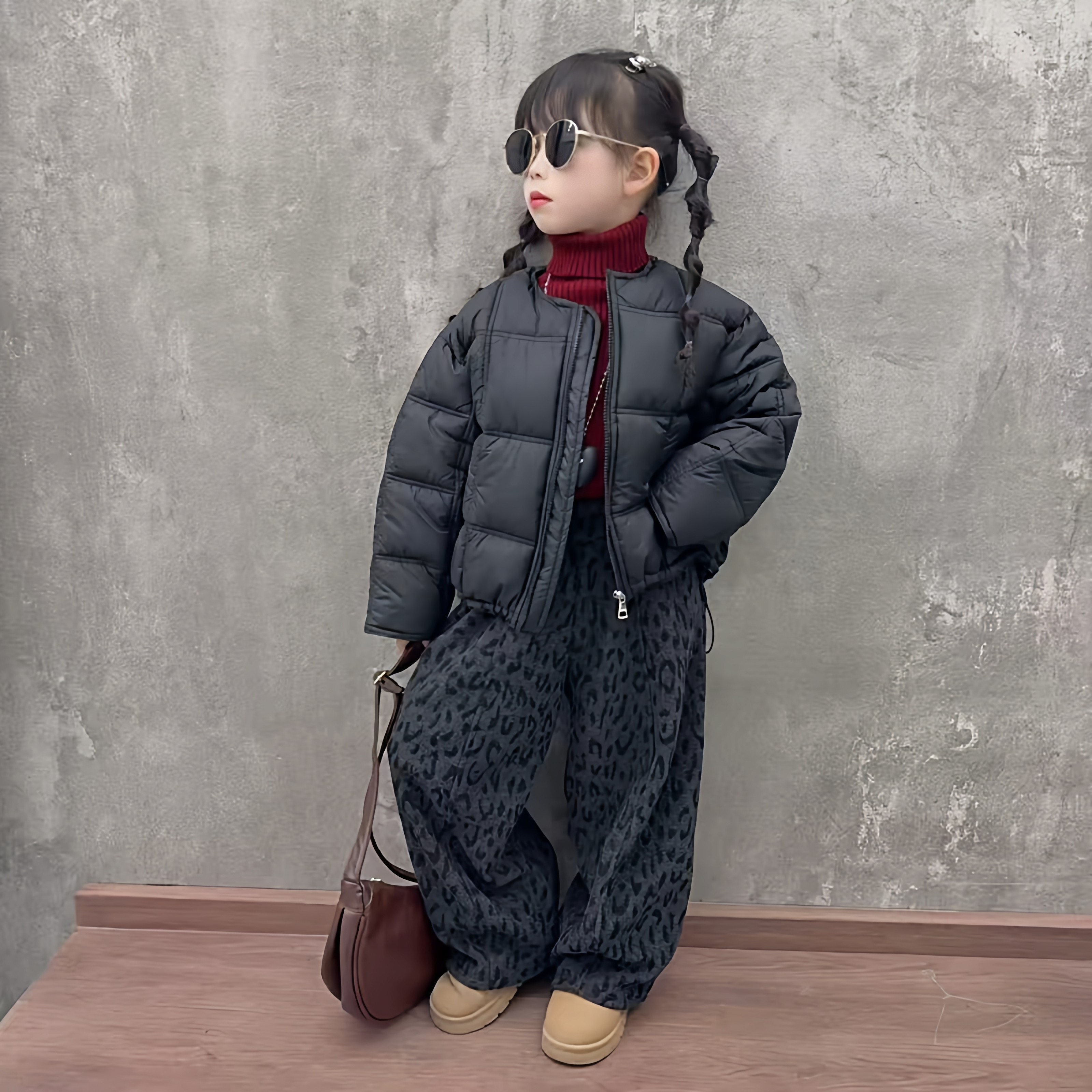 女童韩系泡芙格圆领短款棉服外套美式加绒豹纹弯刀裤潮酷炸街套装