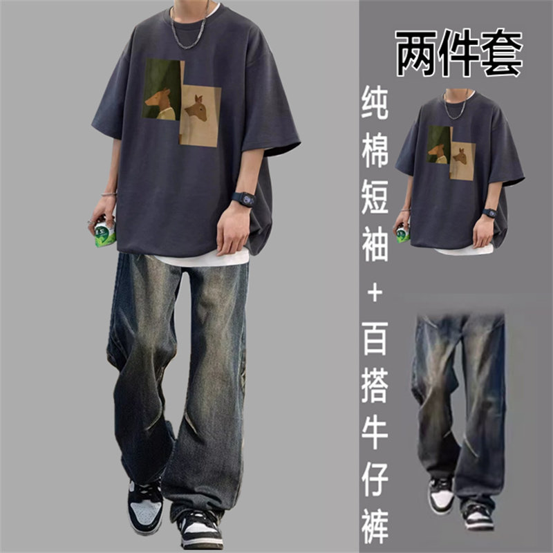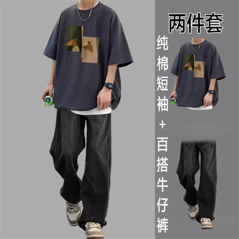 夏季常规款纯棉短袖印花T恤休闲运动套装学生牛仔裤男生男士韩版