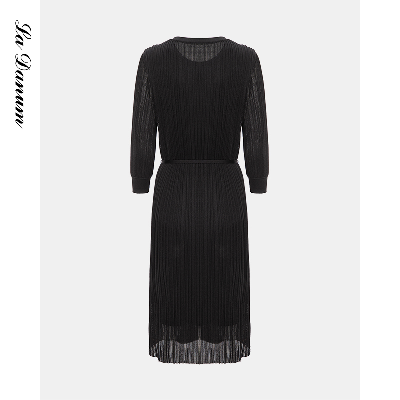阿丹娜春夏黑色圆领钉珠针织连衣裙子长袖气质女装含腰带气质时尚