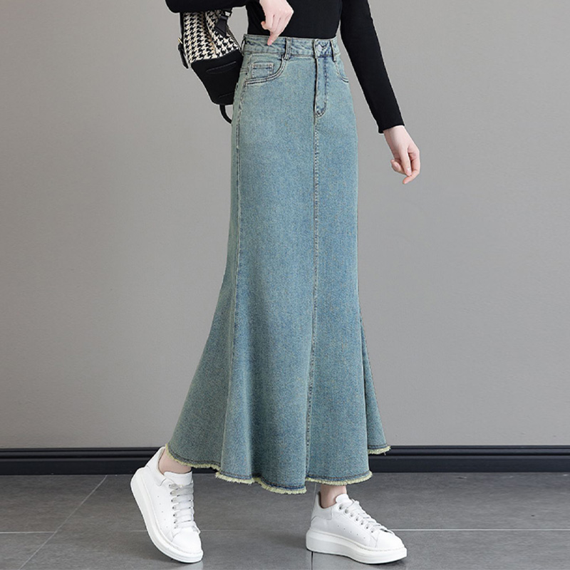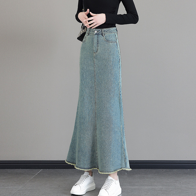 啄木鸟复古鱼尾牛仔半身裙女秋季新款高腰a字长款毛边包臀裙子