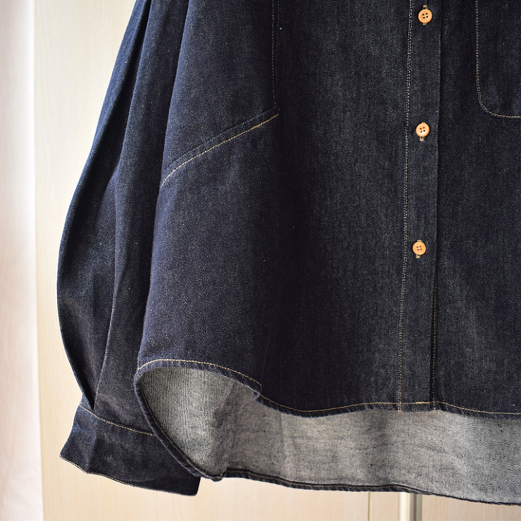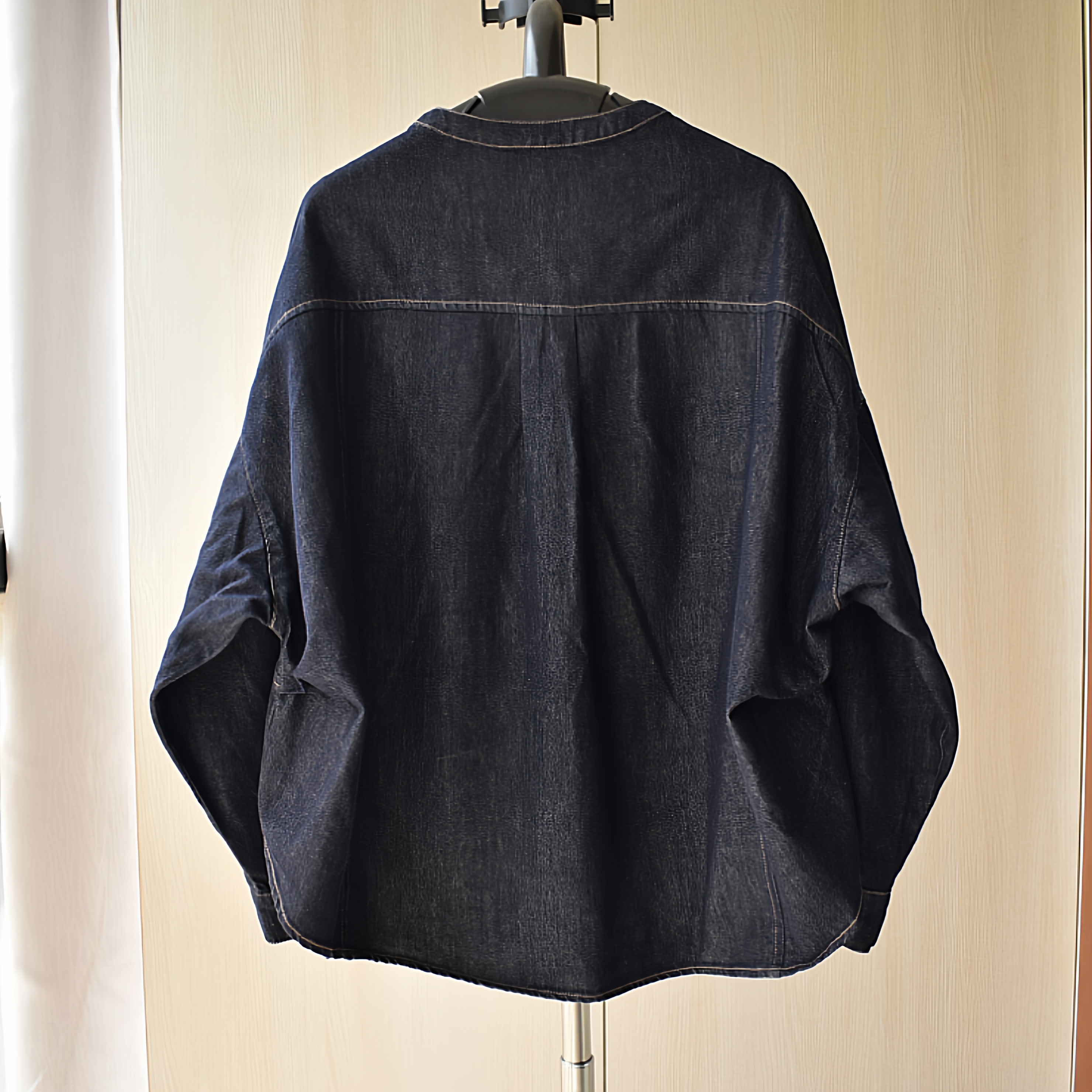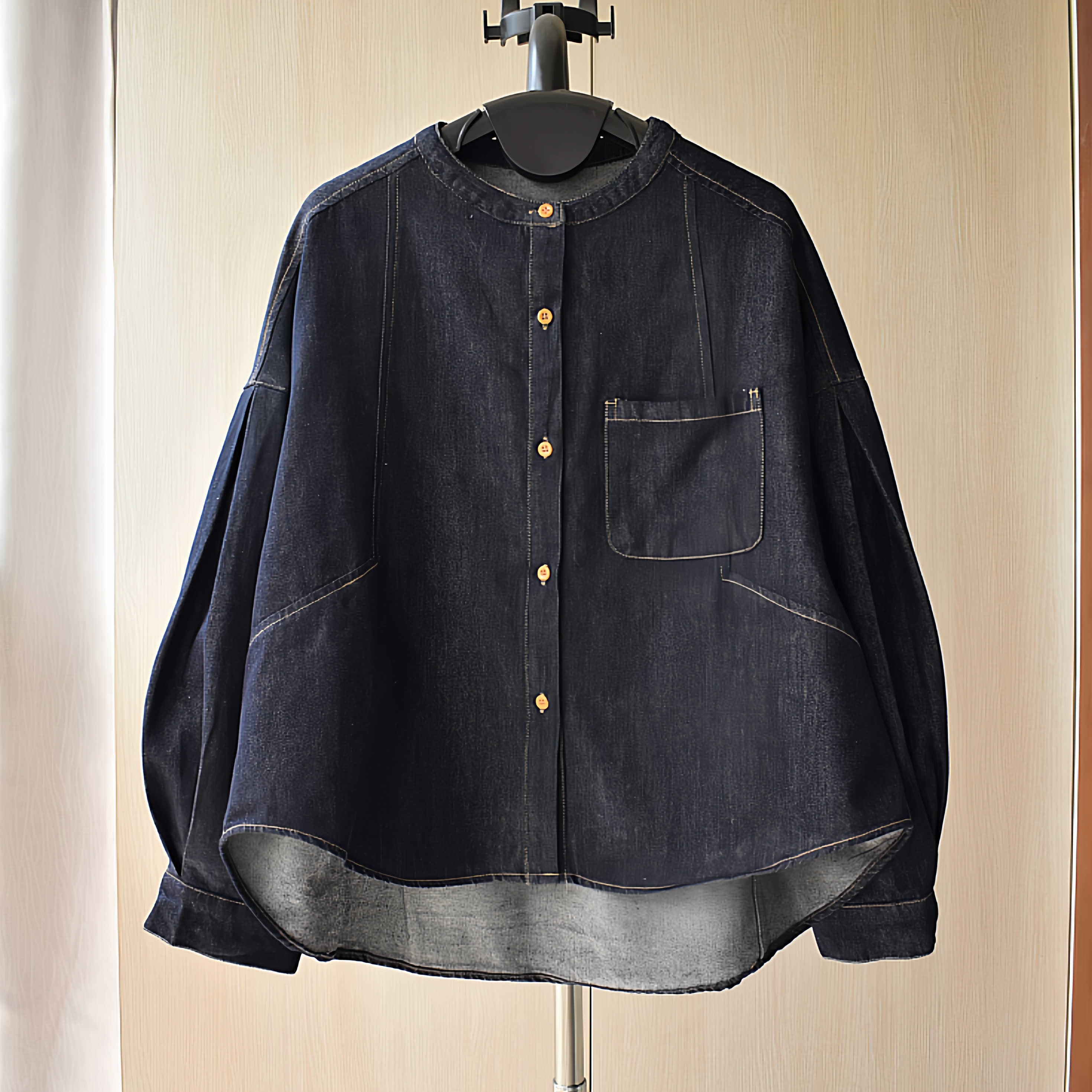 韩版后背褶皱宽松休闲灯笼袖立领牛仔衬衫前短后长时尚牛仔外套女