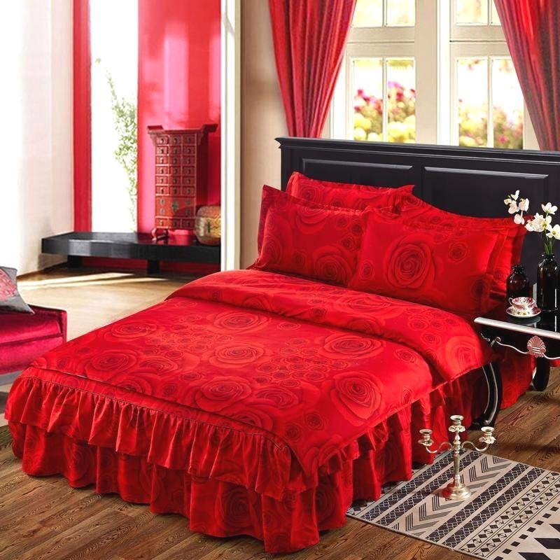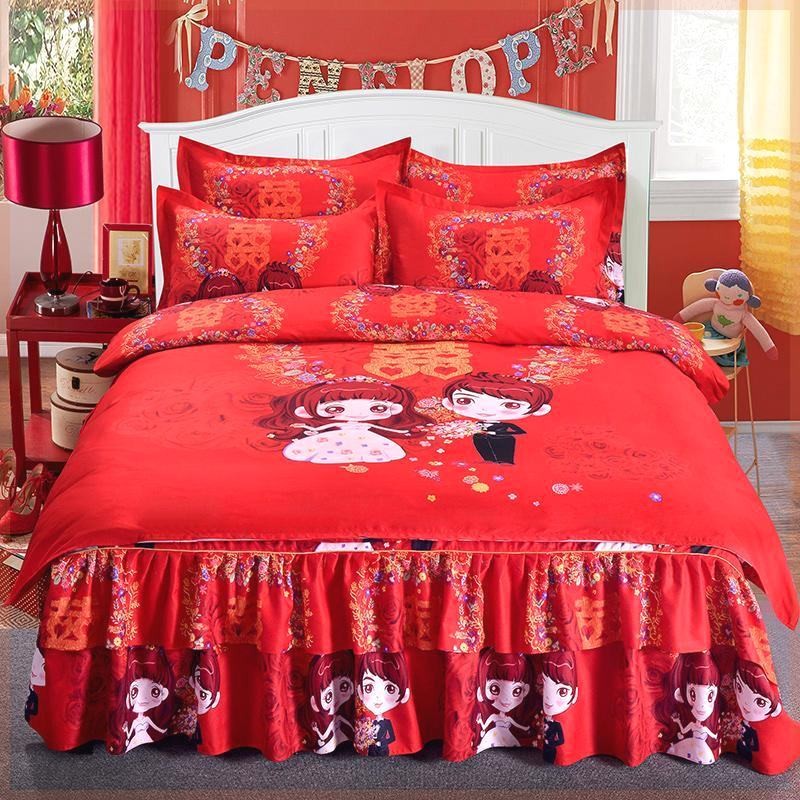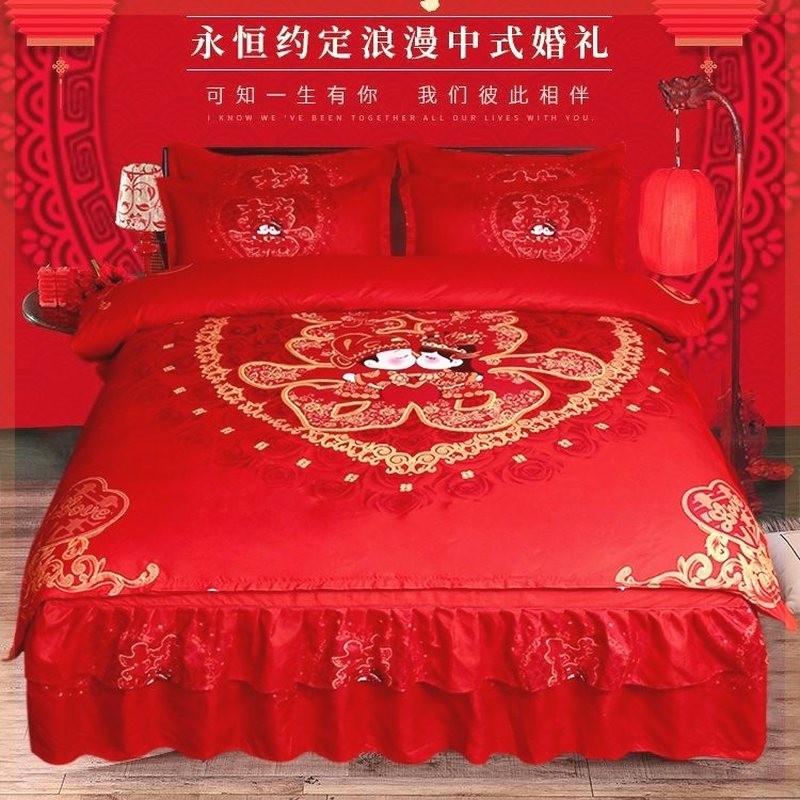 结婚四件套提花像全棉纯棉新婚庆被套罩双人床裙大红色床上用品