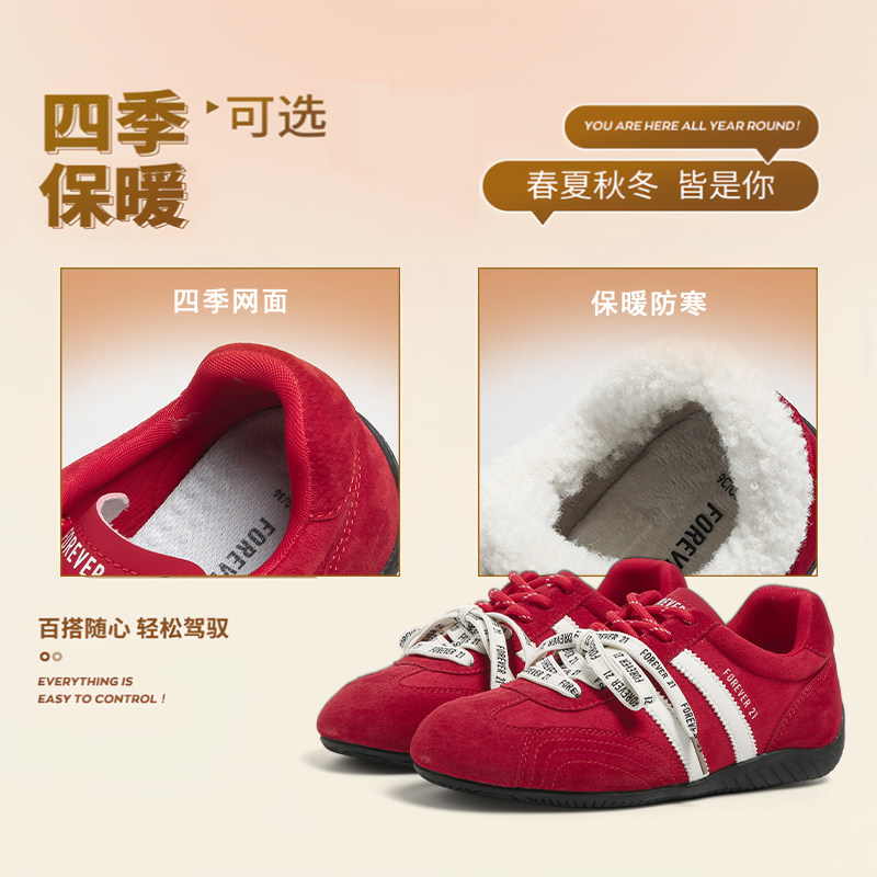 F21真皮红色内增高德训鞋女2025新款秋冬加绒超火软底休闲赛车鞋