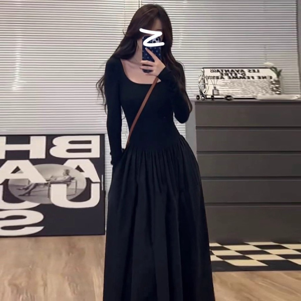 法式茶歇黑色长袖连衣裙子女夏2025春秋新款高级感赫本风收腰长裙