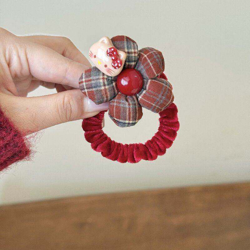 红色格纹花朵发圈儿童秋冬植绒扎发绳可爱卡通丸子头皮筋女童发饰