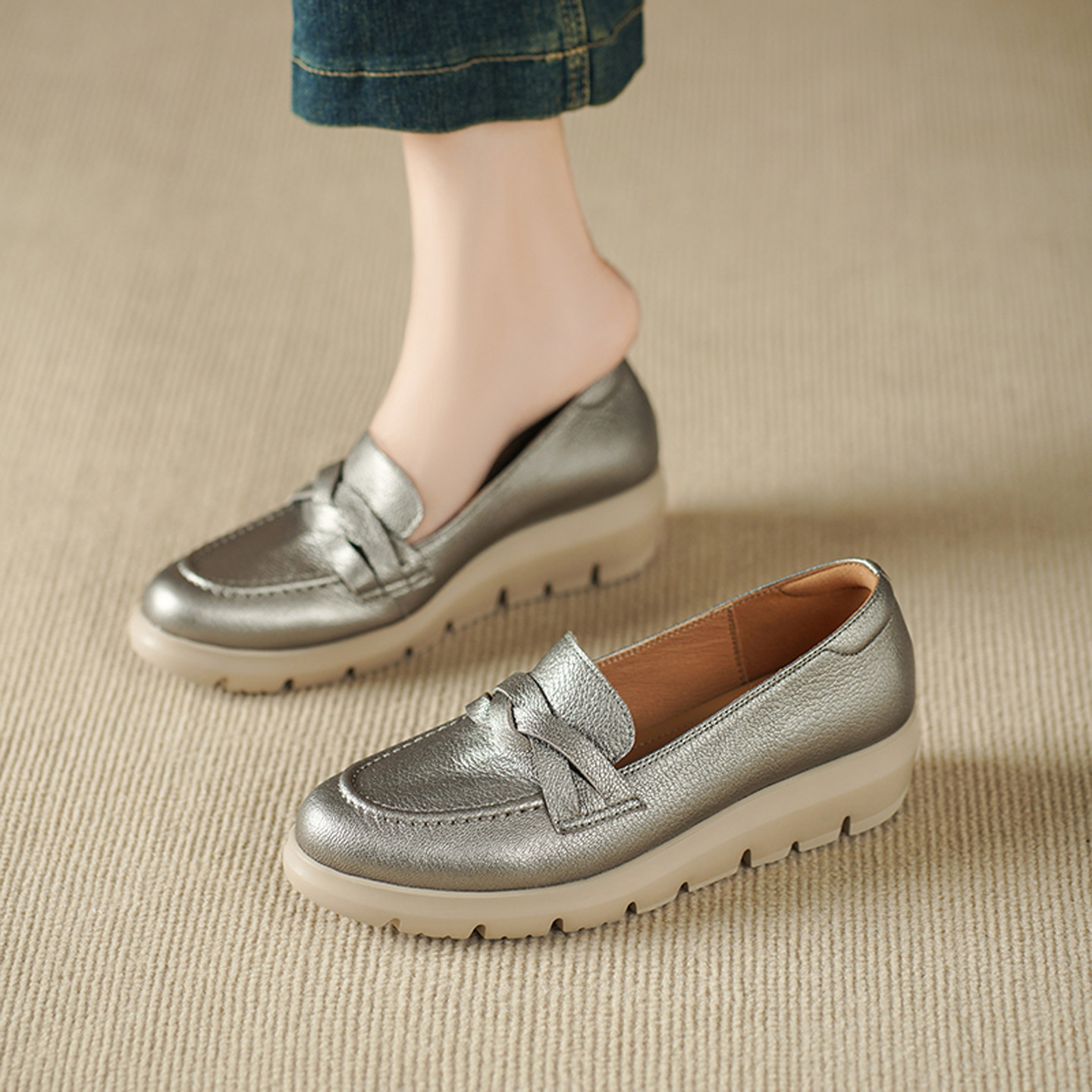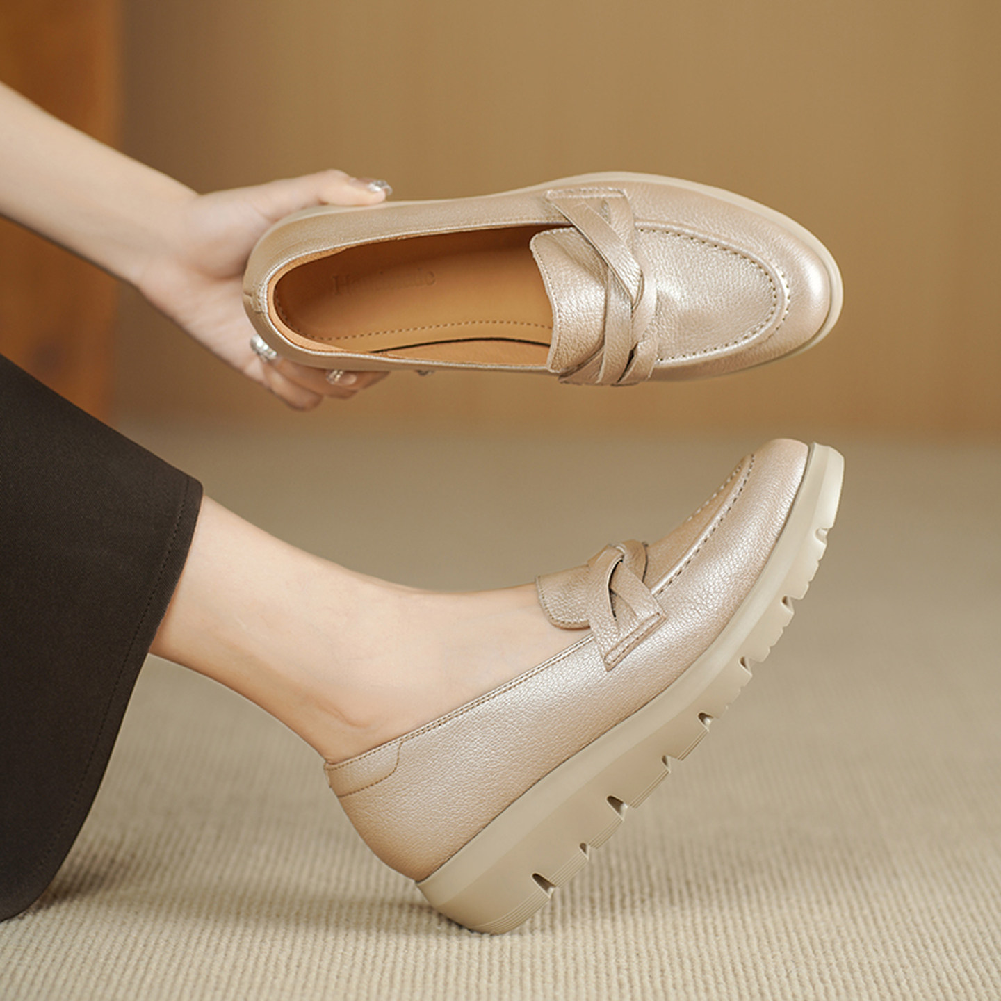2026春秋季新款真皮圆头浅口单鞋女厚底松糕妈妈鞋舒适百搭乐福鞋
