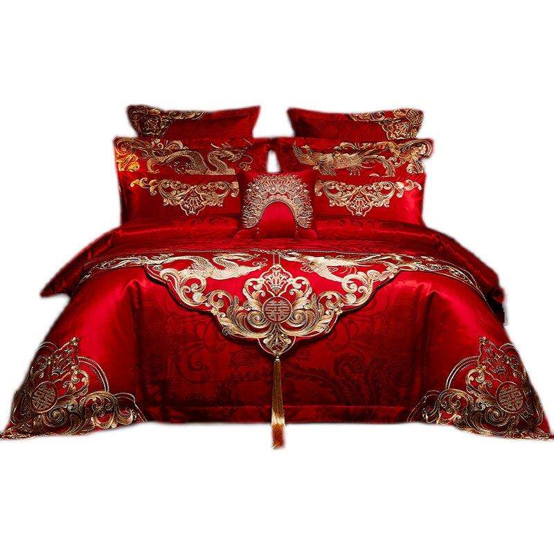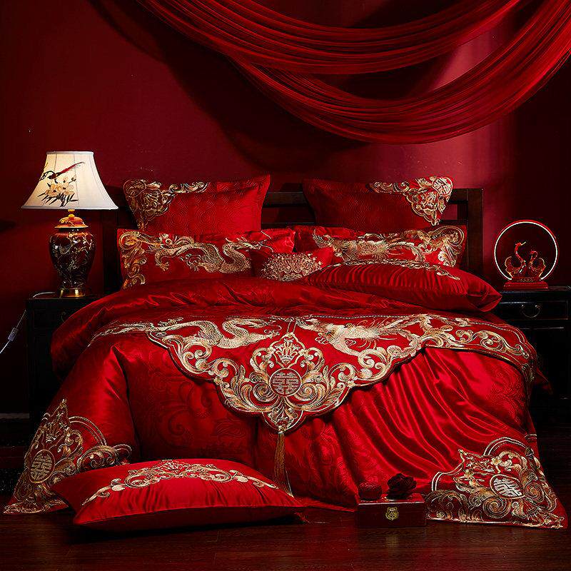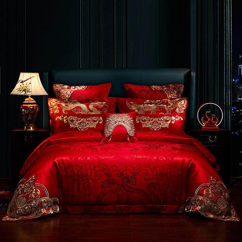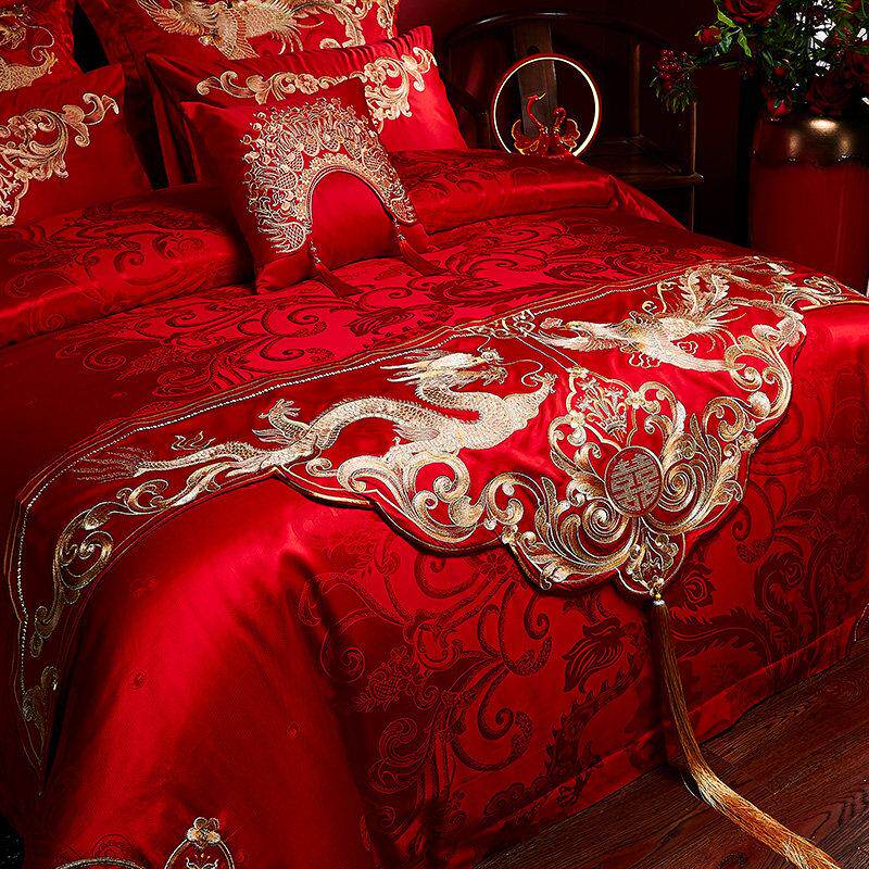 高端婚庆四件组大红色全棉提花龙凤结婚房中式床上用品床单被套轻