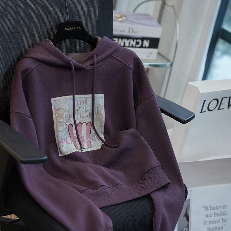 虫小小 复古洋气印花连帽加绒加厚保暖卫衣女短外套上衣秋冬A70D