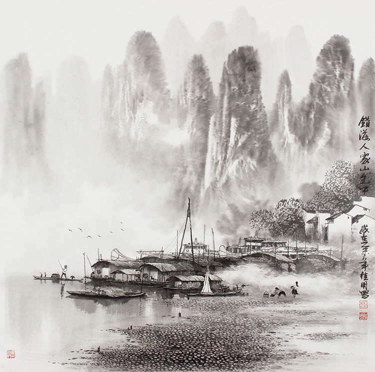 国画山水无水泰山客厅办公室风水画靠山图手绘名家水墨画旭日东升