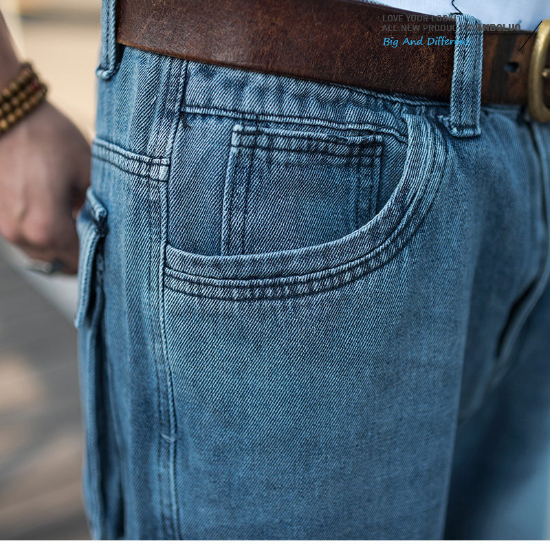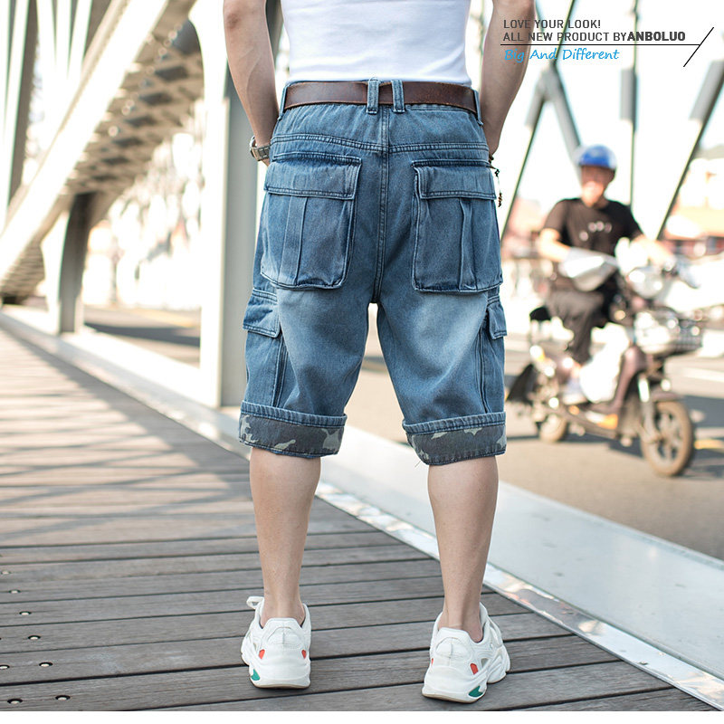 潮男大码卷边七分裤 嘻哈阔腿牛仔裤 魔术贴口袋肥佬宽松牛仔短裤
