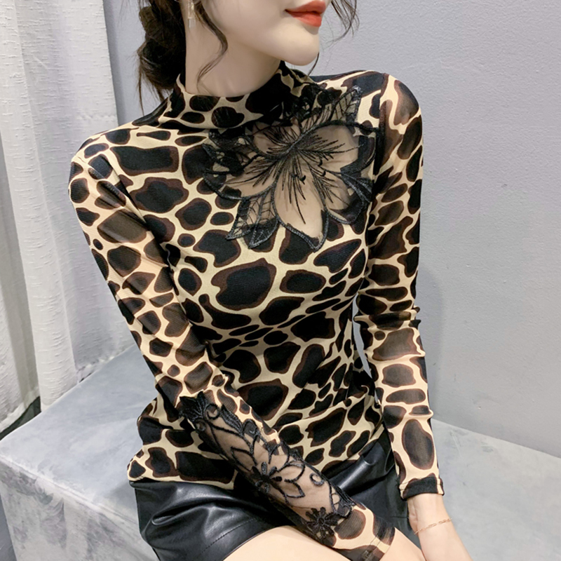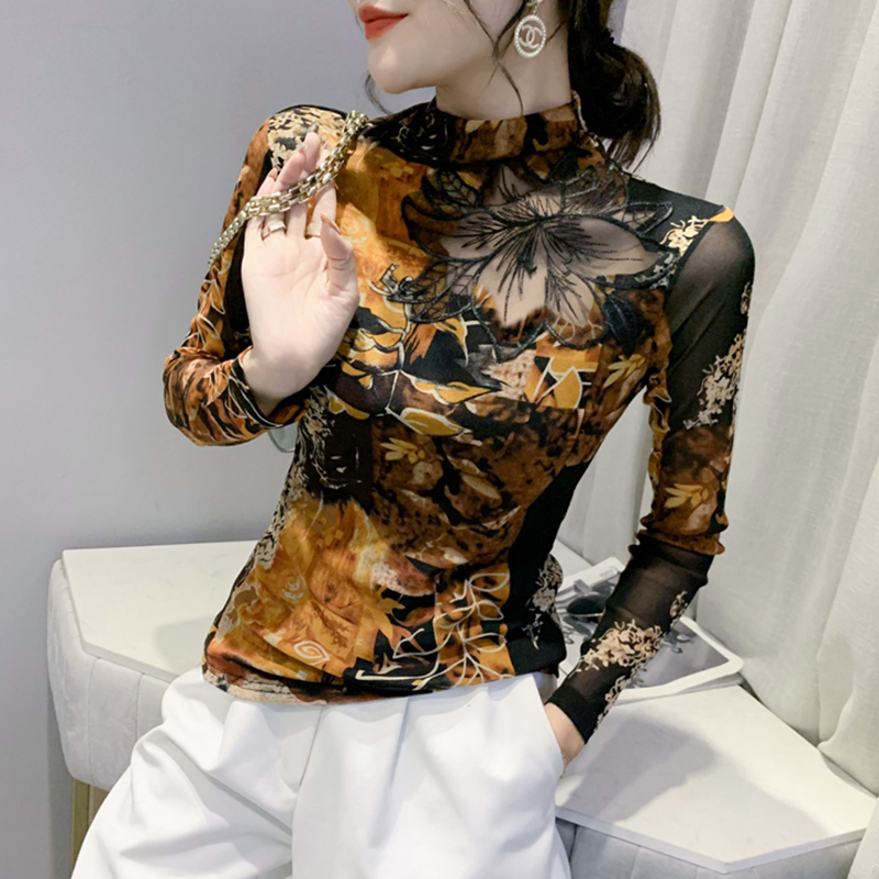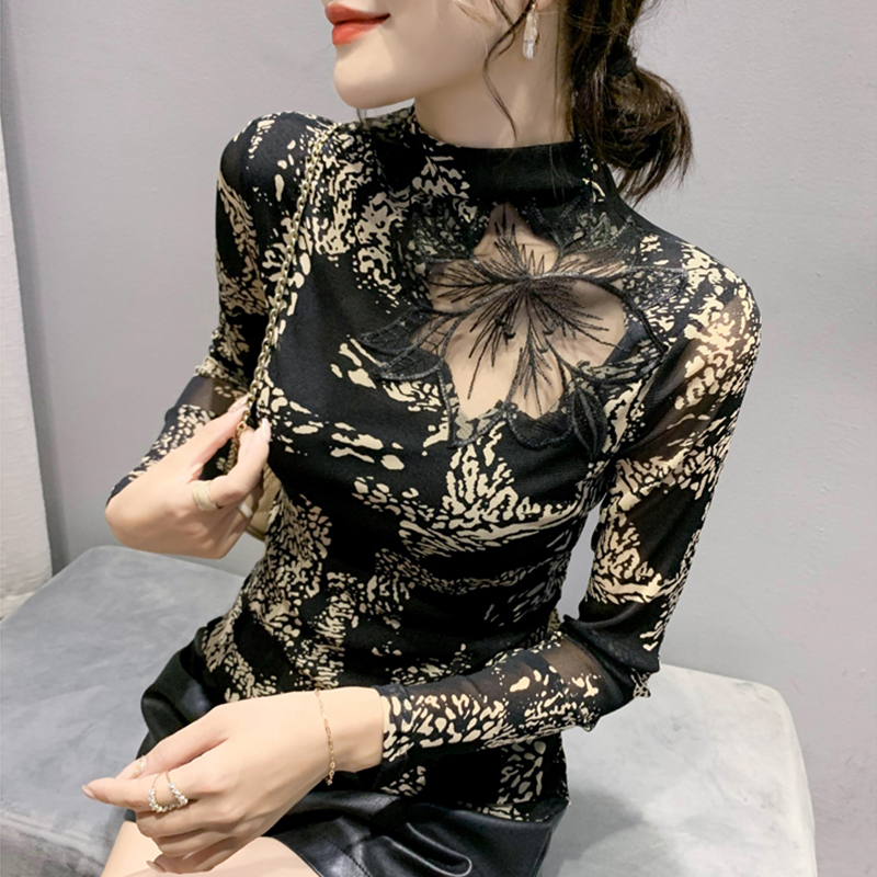 半高领打底衫女性感镂空网纱上衣