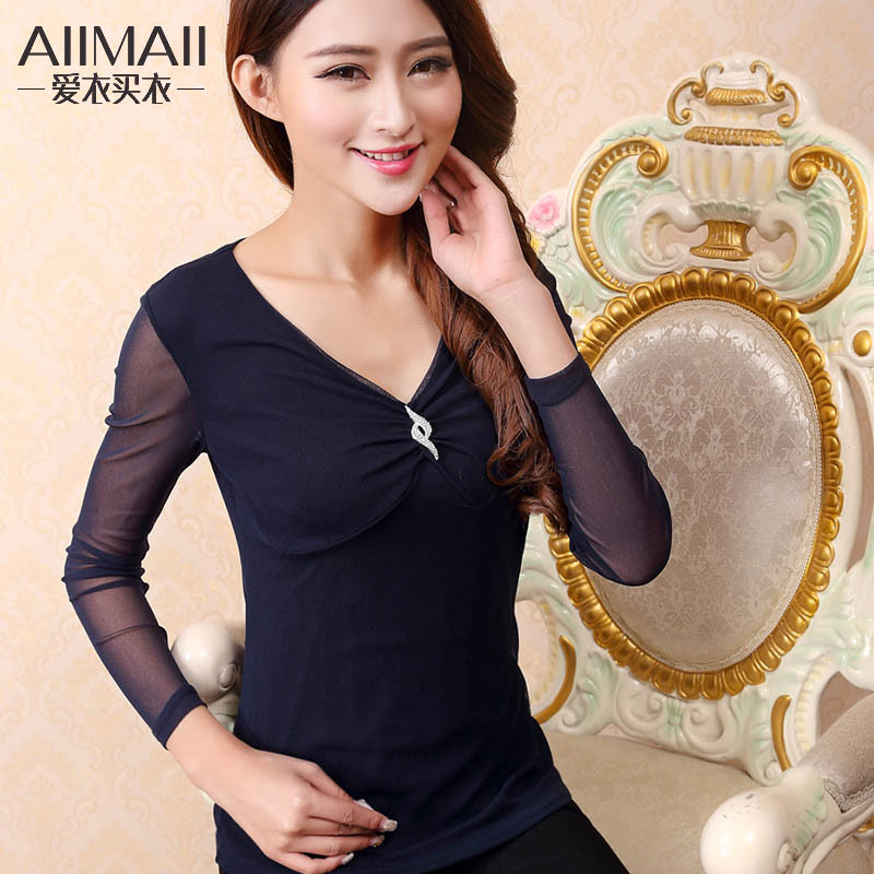 2025春秋新款韩版长袖t恤女大码黑色紧身v领网纱蕾丝女打底衫薄款