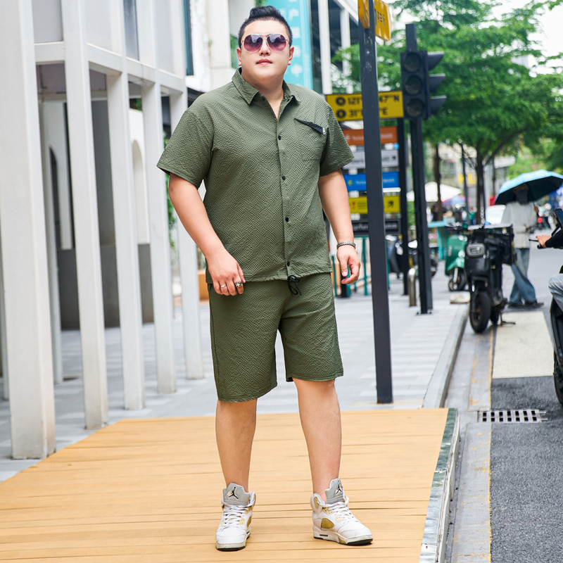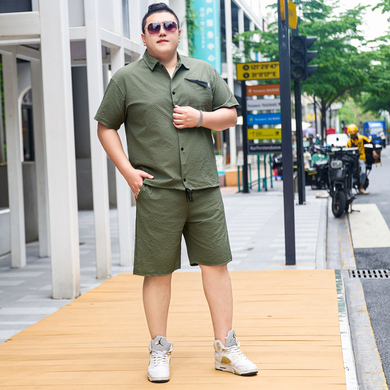 超大码男装加肥加大码翻领休闲衬衫套装夏装肥佬宽松短袖两件套薄