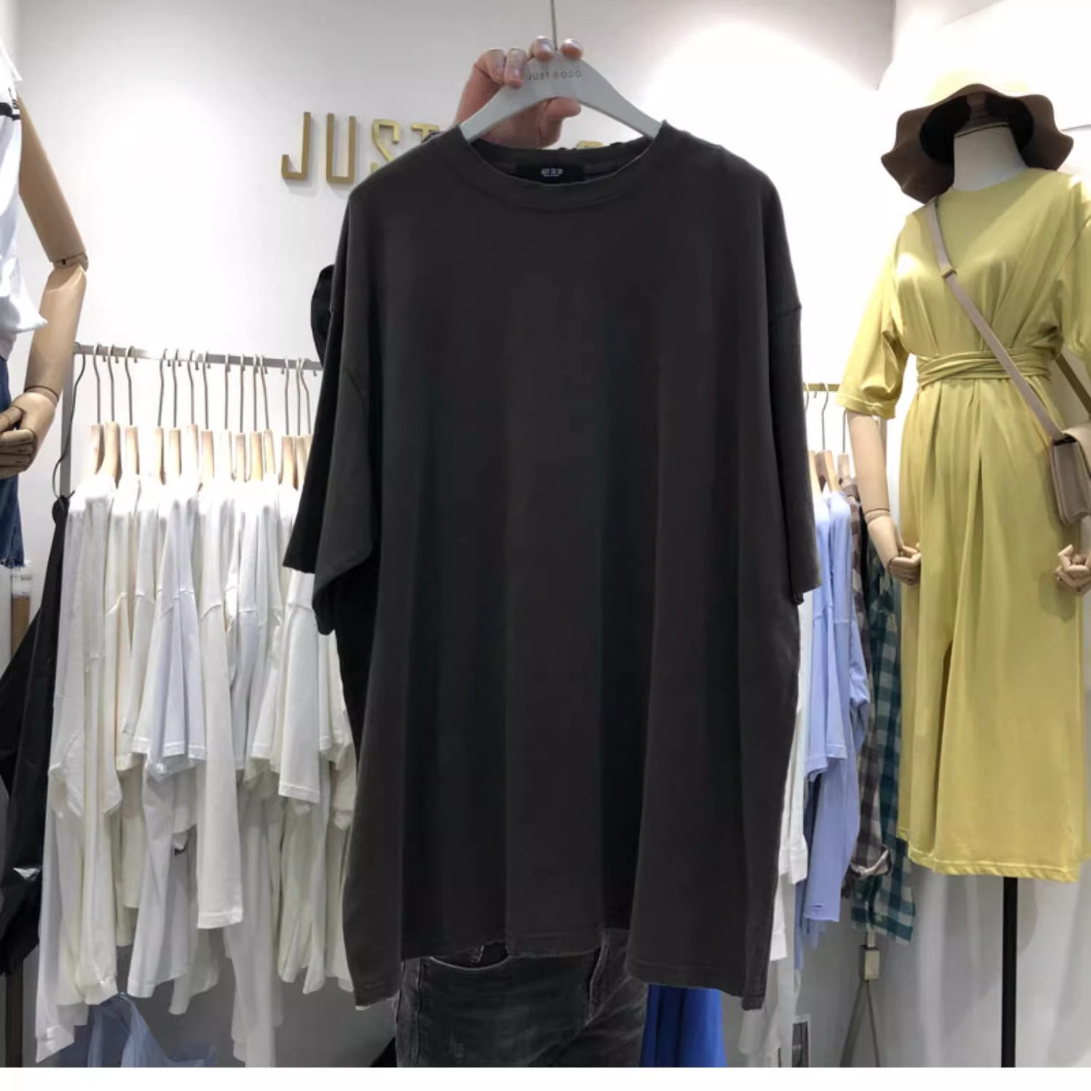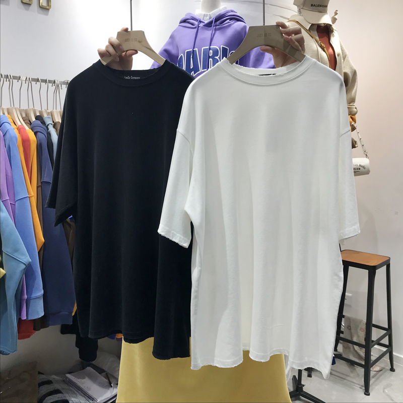 韩国东大门纯色短袖T恤女中长款宽松大码显瘦显白百搭做旧洗水棉