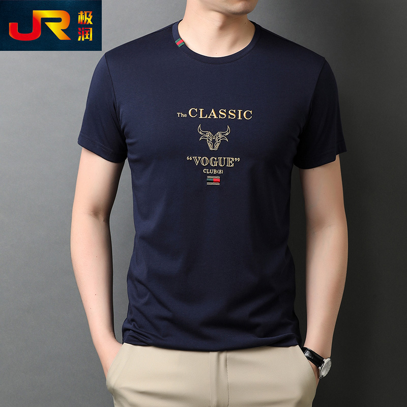 男士莫代尔圆领冰丝短袖t恤衫潮流刺绣中青年半袖桑蚕丝打底汗衫